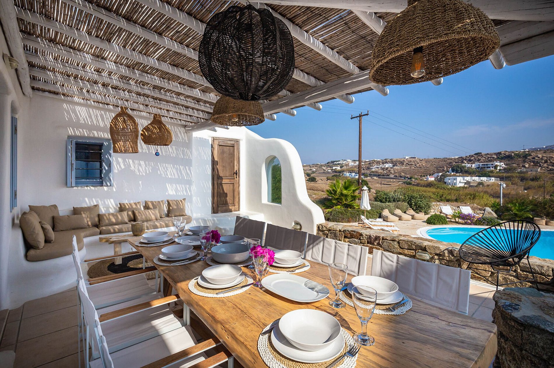 La villa est située dans le sud de Mykonos, surplombant les plages de Paraga et Platis Gialos, dans une région isolée avec un accès facile à l'aéroport et au centre historique.