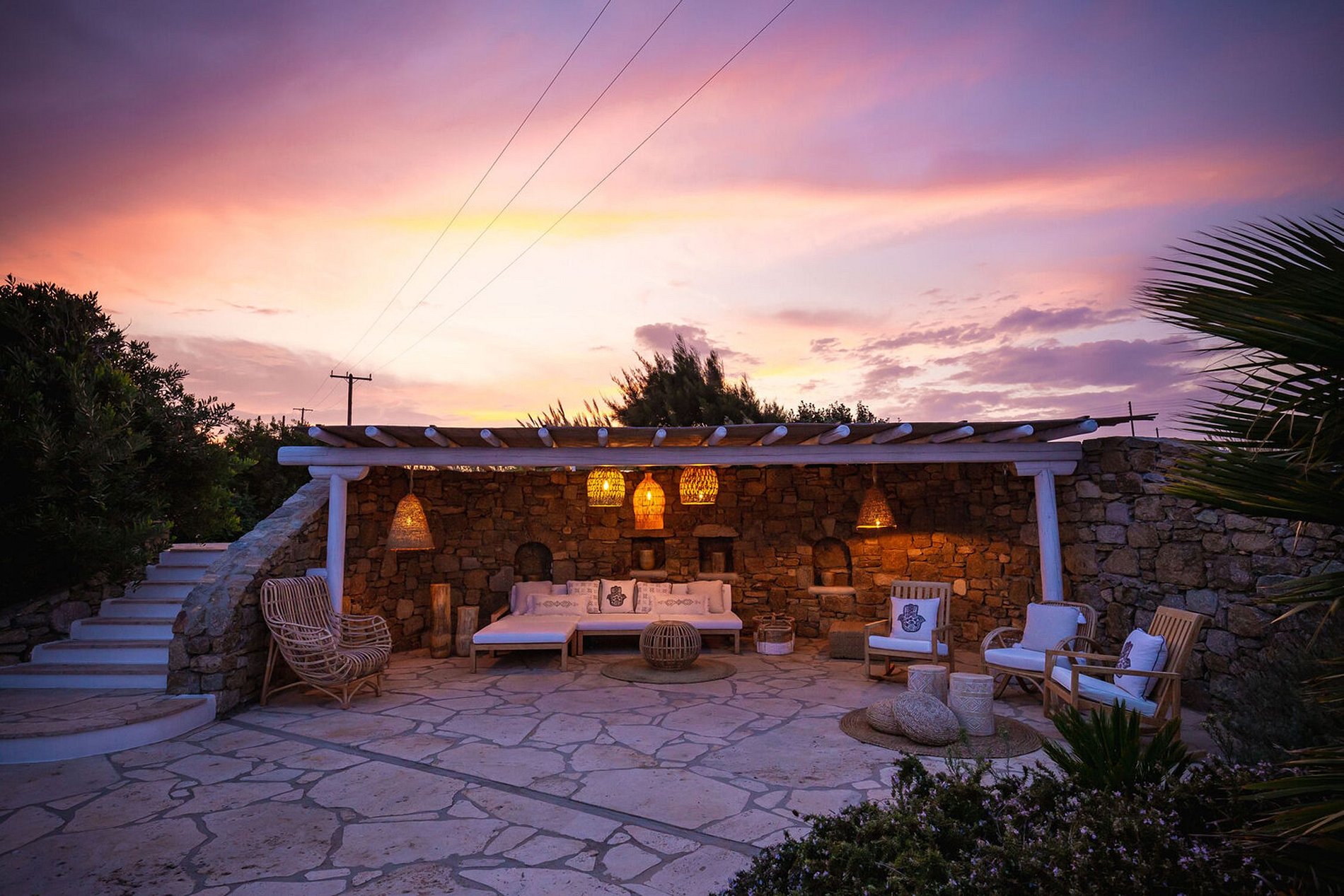 La villa est située dans le sud de Mykonos, surplombant les plages de Paraga et Platis Gialos, dans une région isolée avec un accès facile à l'aéroport et au centre historique.