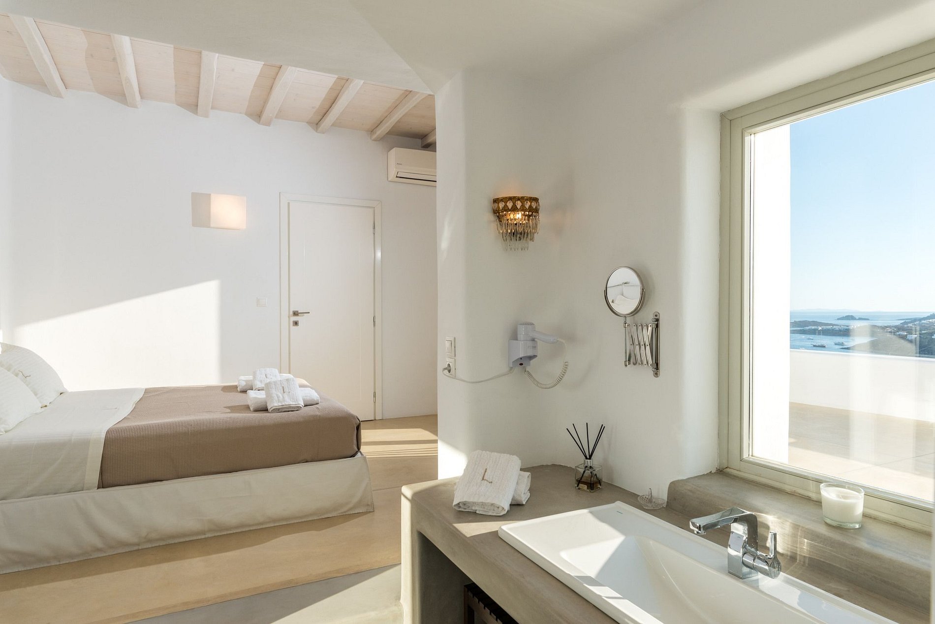 La spacieuse villa de 230m2 est entourée par la beauté et la sérénité de l'esprit de Mykonos avec de charmants détails et une vue splendide sur la colline.