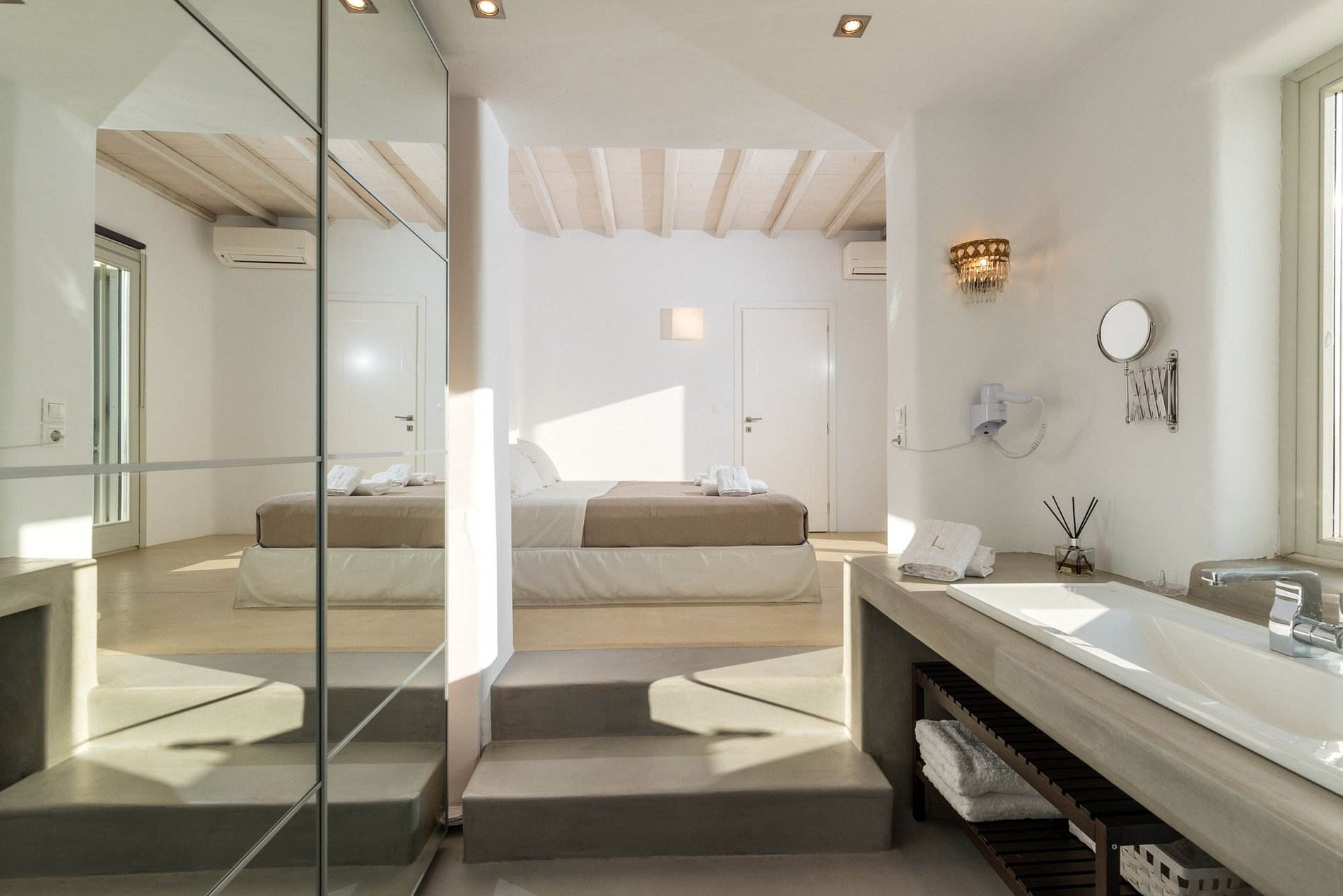 La spacieuse villa de 230m2 est entourée par la beauté et la sérénité de l'esprit de Mykonos avec de charmants détails et une vue splendide sur la colline.