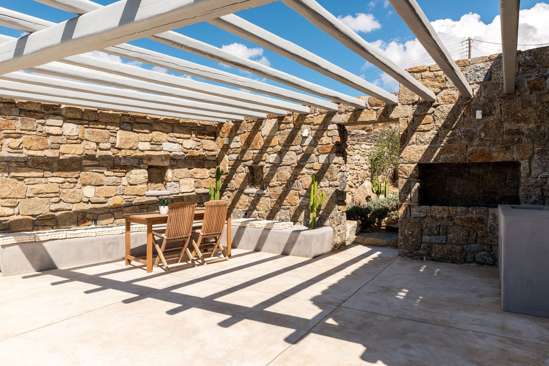 La spacieuse villa de 230m2 est entourée par la beauté et la sérénité de l'esprit de Mykonos avec de charmants détails et une vue splendide sur la colline.