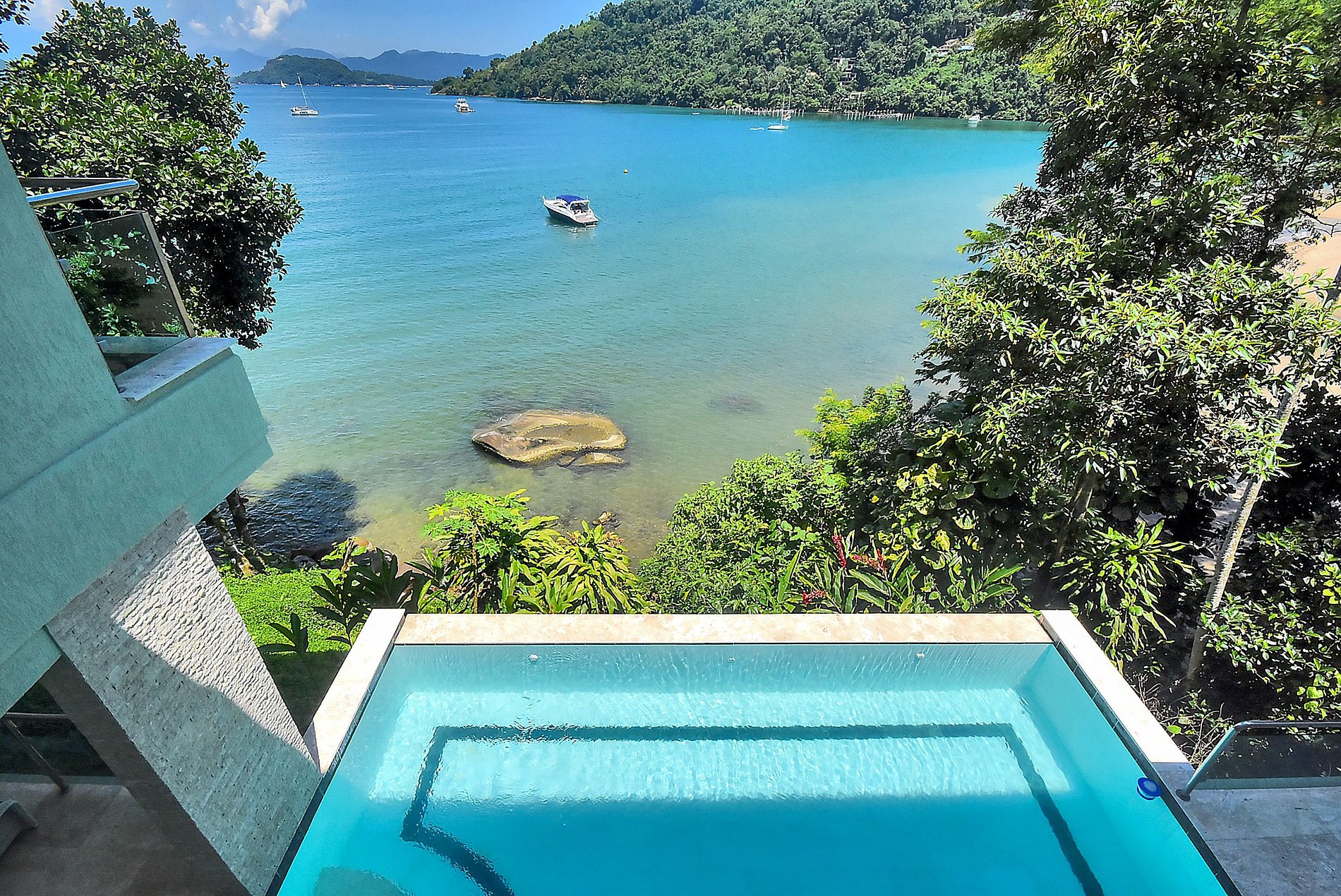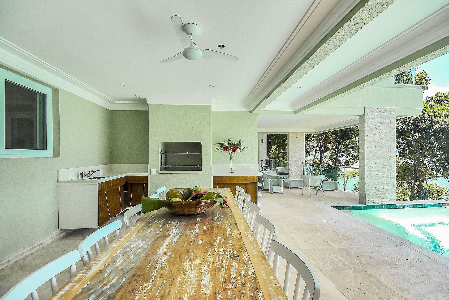 En passant par le salon, nous avons accès à l'espace piscine qui dispose d'un barbecue et d'une grande table à manger et donne accès à des sentiers dans le terrain, 2 sources et une plage aux eaux calmes et cristallines. La villa dispose d'un parking pour jusqu'à 4 voitures et se trouve à quelques minutes d'autres plages incroyables, de la marina de Piraquara et du quartier de Frade.