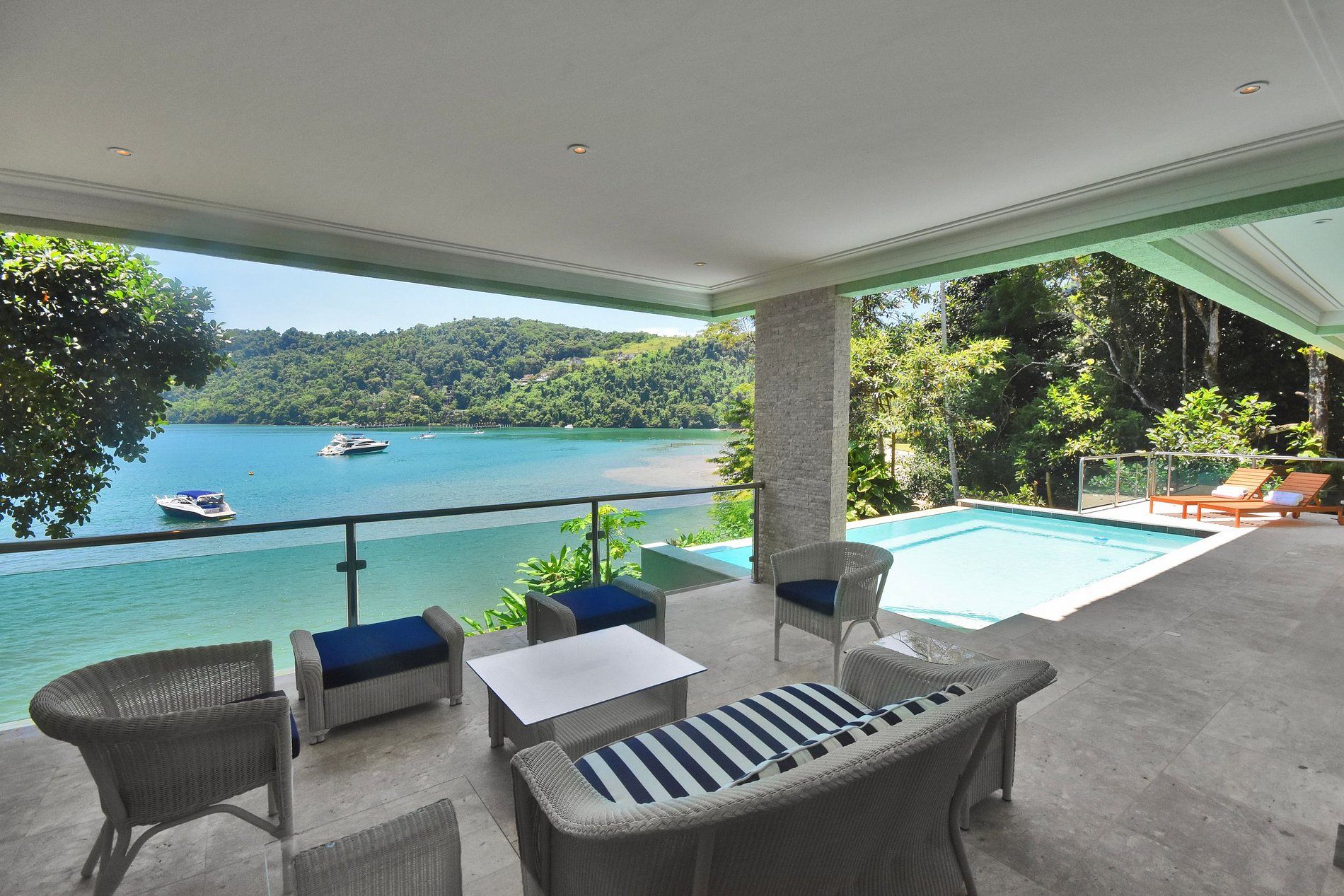 En passant par le salon, nous avons accès à l'espace piscine qui dispose d'un barbecue et d'une grande table à manger et donne accès à des sentiers dans le terrain, 2 sources et une plage aux eaux calmes et cristallines. La villa dispose d'un parking pour jusqu'à 4 voitures et se trouve à quelques minutes d'autres plages incroyables, de la marina de Piraquara et du quartier de Frade.