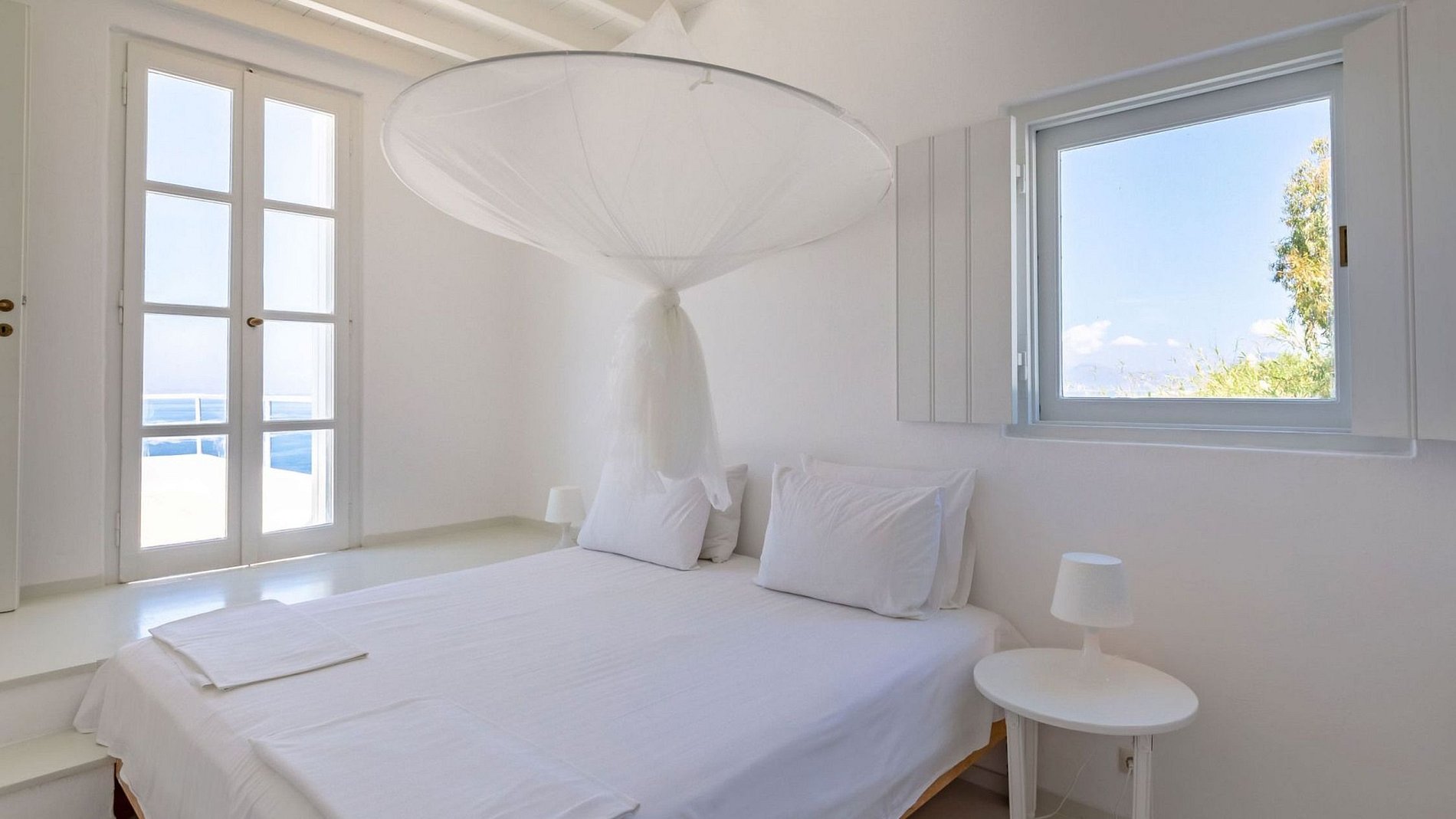 Cette villa au design minimaliste est située juste au-dessus du vieux port de Mykonos et entourée de plus de 60 oliviers. Un chemin de pierres blanches mène les clients à une pergola ombragée intégrée le long de l'oliveraie, permettant d'agréables repas en plein air. À seulement trois minutes à pied de la vieille ville, la villa est située au milieu d'un grand jardin et surplombe le port, les îles de Rhenia, Syros et Tinos.
