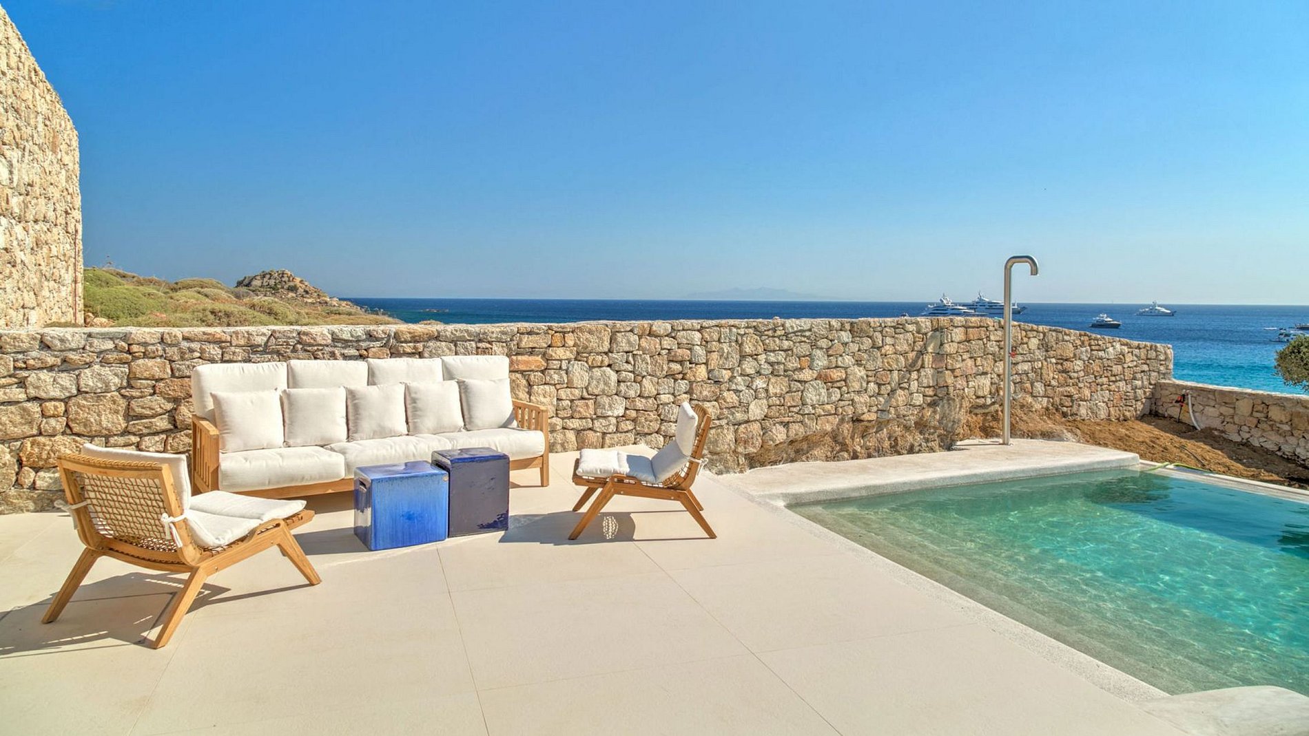 La villa a une vue imprenable sur la baie de Platis Gialos avec tous les parasols colorés et les yachts amarrés en arrière-plan.