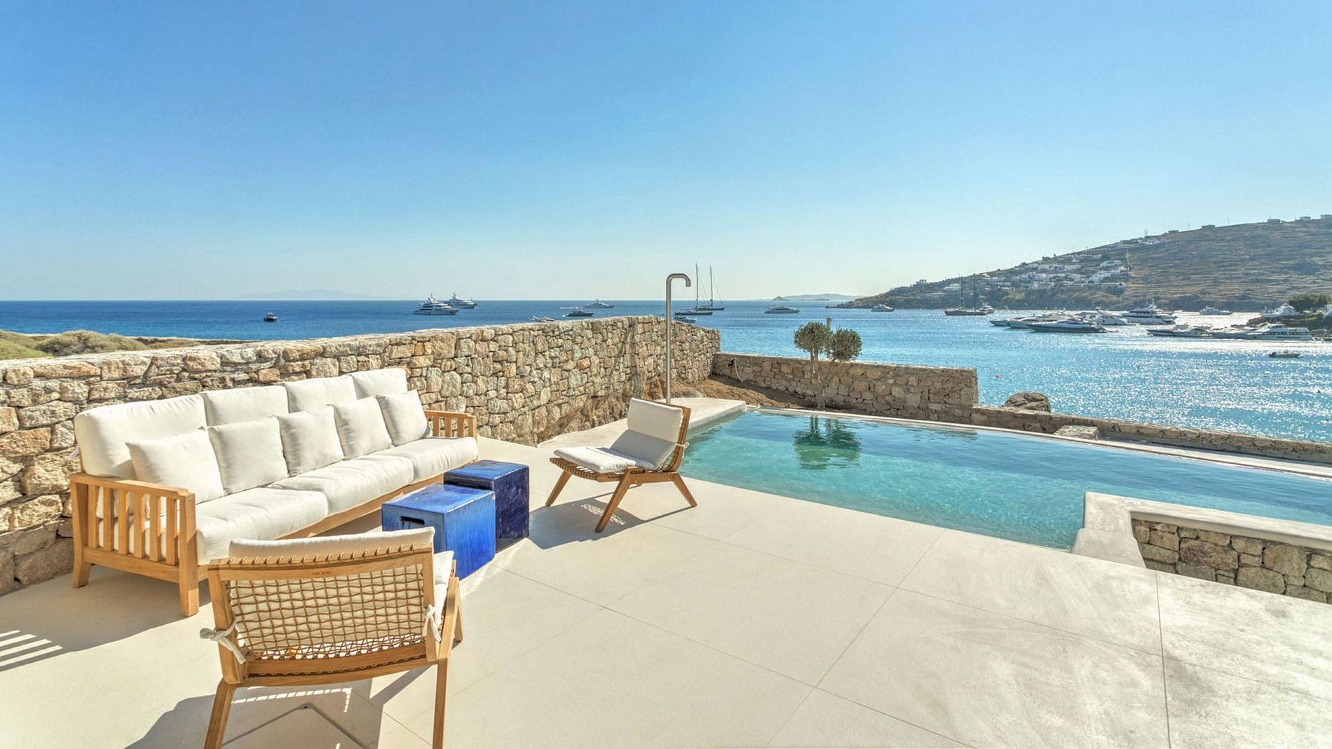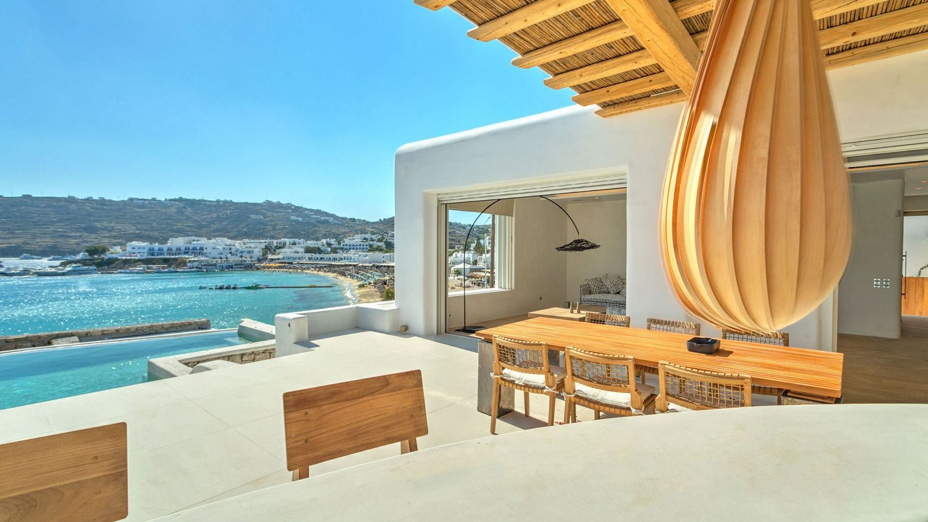 La villa a une vue imprenable sur la baie de Platis Gialos avec tous les parasols colorés et les yachts amarrés en arrière-plan.