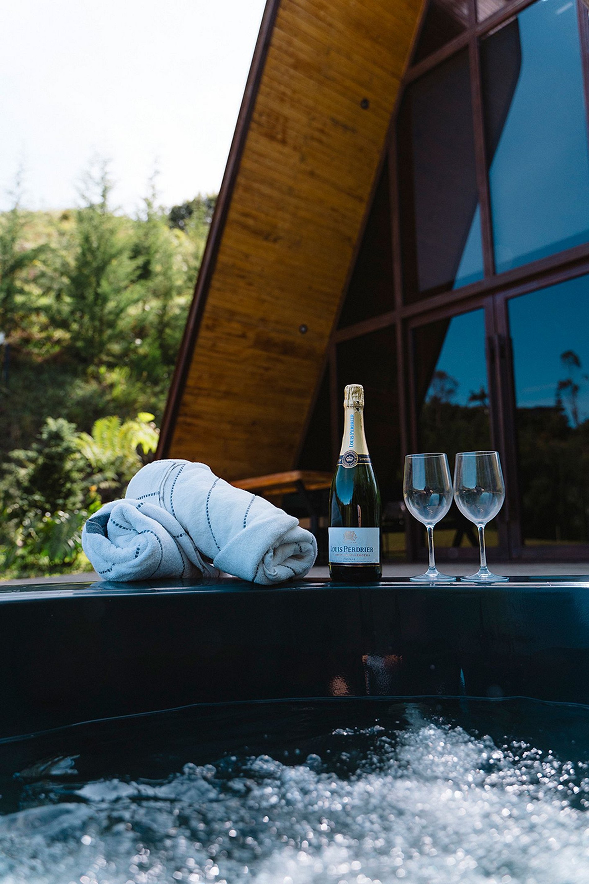 La cabane dispose d'une variété d'équipements luxueux conçus pour la détente et les loisirs. Vous pouvez plonger dans la piscine privée entourée de verdure luxuriante ou vous détendre dans le jacuzzi surplombant les eaux sereines. Pour ceux qui souhaitent rester actifs, profitez d'un match amical sur le terrain de badminton ou rassemblez-vous autour du foyer extérieur pour une soirée sous les étoiles.