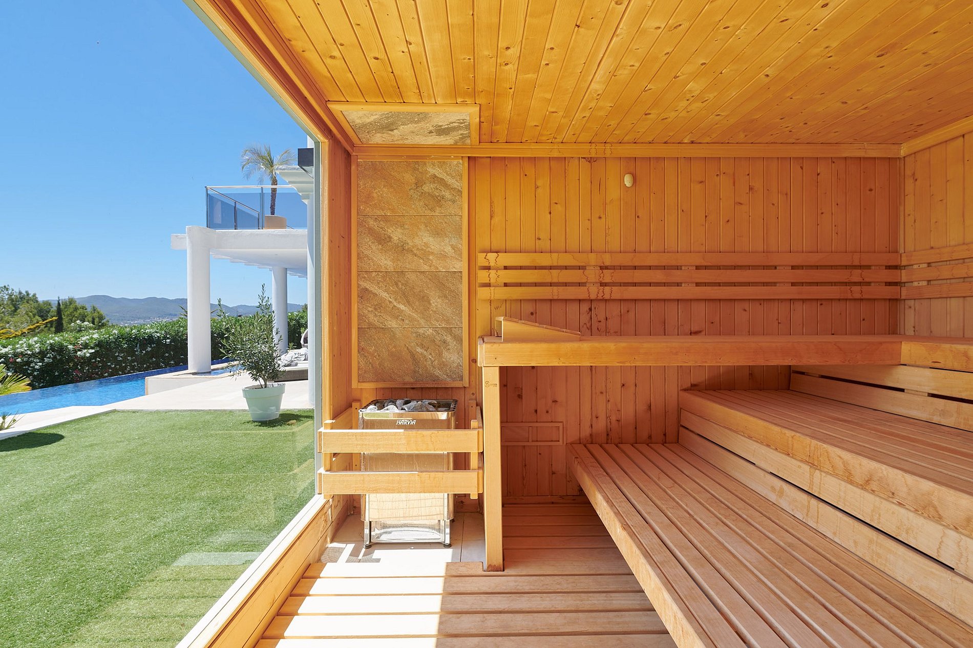 L'espace extérieur de la villa offre de nombreuses possibilités pour passer du temps dans le magnifique jardin ou le sauna à côté de la piscine. Toutes les terrasses ont des zones de détente avec une vue imprenable sur la ville d'Ibiza et la Méditerranée.