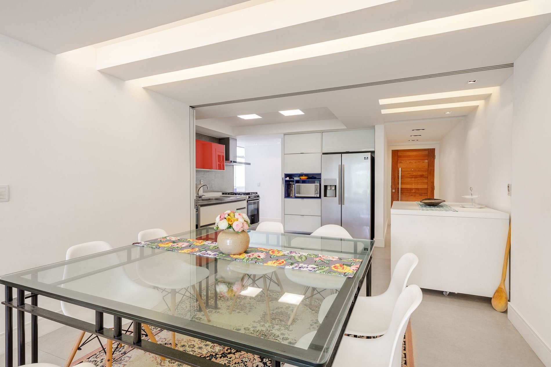 Dans l'ensemble, l'appartement présente un design absolument contemporain avec des couleurs riches qui attirent l'attention et plaisent à tout le monde.