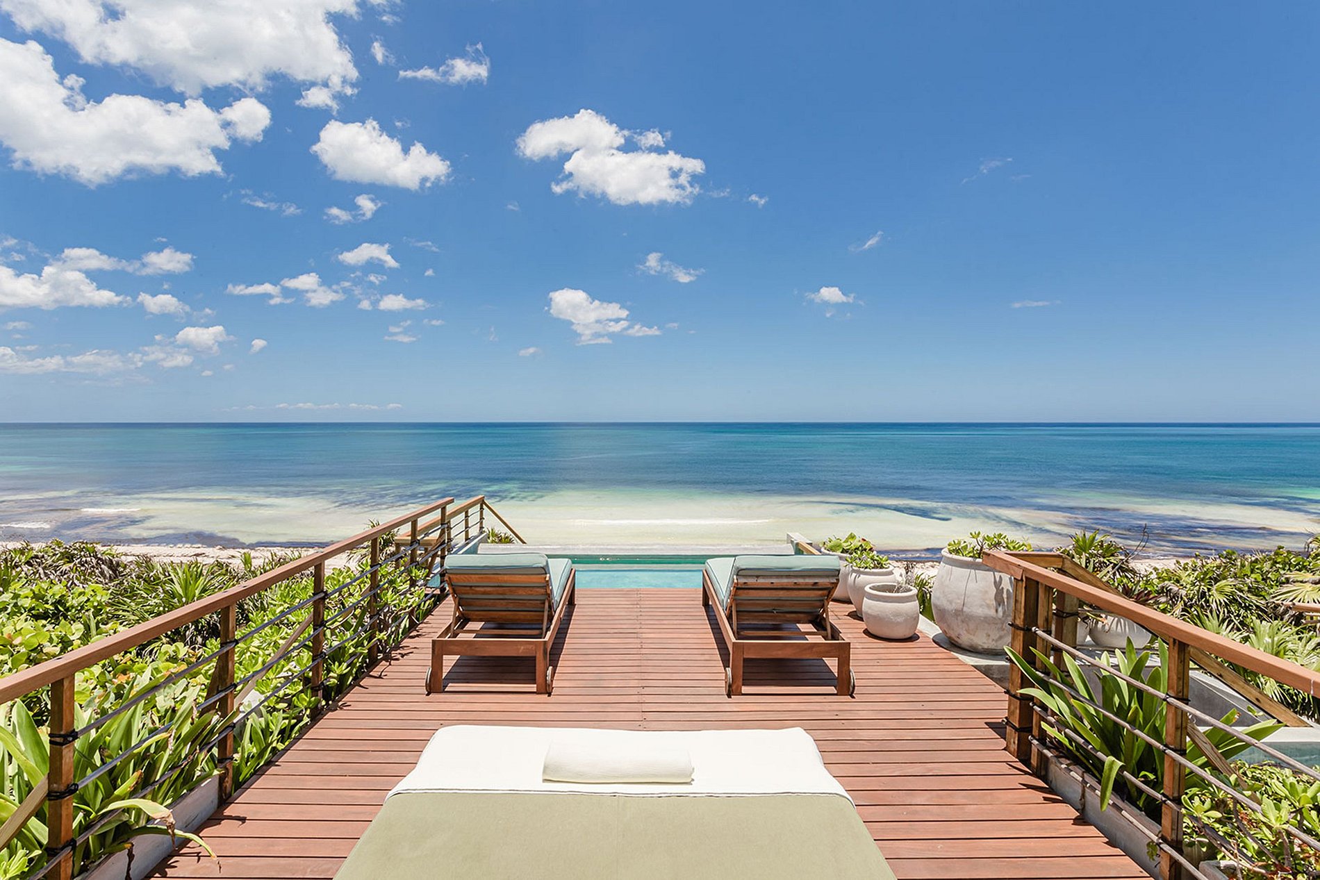 Au-delà de la principale «palapa», les dunes naturelles, avec leurs palmiers et leurs hamacs douillets, sont le prélude à une incroyable plage de sable blanc privée. Montez au niveau supérieur et vous trouverez une vue fascinante à 360 degrés sur la propriété de 4,5 acres, avec le lagon d'un côté et la mer des Caraïbes de l'autre. La terrasse sur le toit, un endroit idéal pour regarder les couchers de soleil, dispose également d'une piscine à débordement où vous pourrez passer des heures à vous détendre et à contempler l'océan.