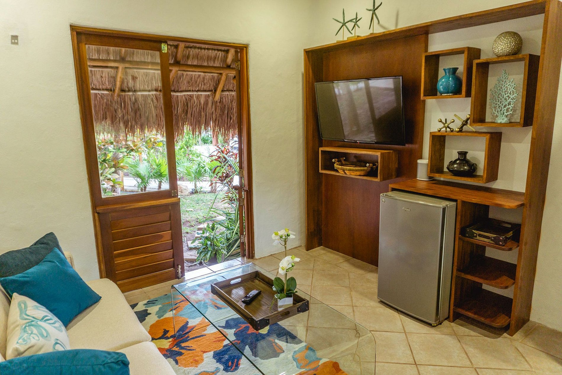 Pouvant accueillir jusqu'à 10 personnes, la villa dispose de cinq magnifiques chambres. Trois chambres offrent des salles de bains privatives avec jacuzzis, climatisation, coin salon et kitchenette. La quatrième chambre comprend une salle de bain attenante complète et deux lits jumeaux, avec un cadre de lit fabriqué à partir d'un tronc d'arbre naturel et de racines, ajoutant au charme d'inspiration caribéenne qui allie confort moderne et merveilles de la nature.