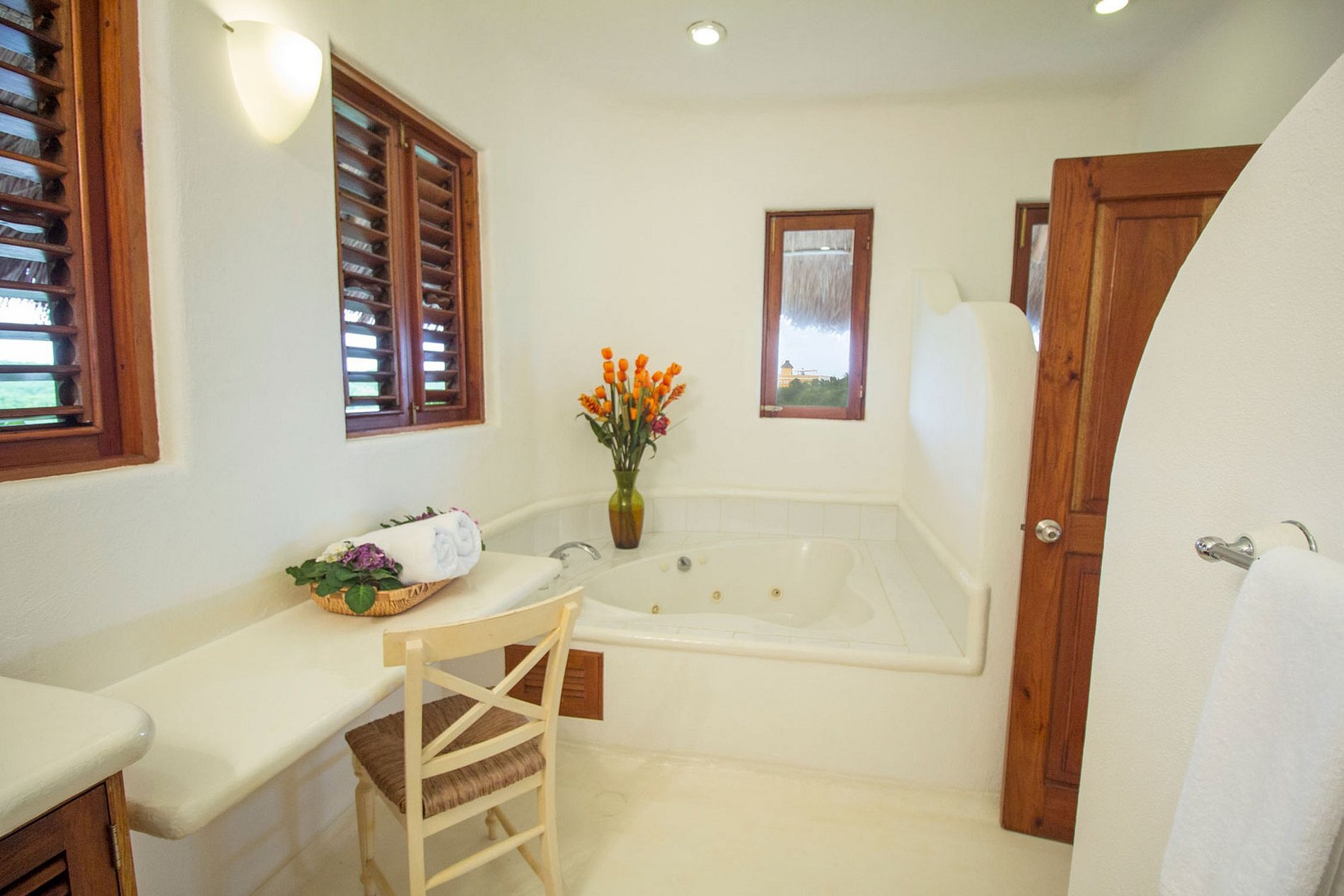 Pouvant accueillir jusqu'à 10 personnes, la villa dispose de cinq magnifiques chambres. Trois chambres offrent des salles de bains privatives avec jacuzzis, climatisation, coin salon et kitchenette. La quatrième chambre comprend une salle de bain attenante complète et deux lits jumeaux, avec un cadre de lit fabriqué à partir d'un tronc d'arbre naturel et de racines, ajoutant au charme d'inspiration caribéenne qui allie confort moderne et merveilles de la nature.
