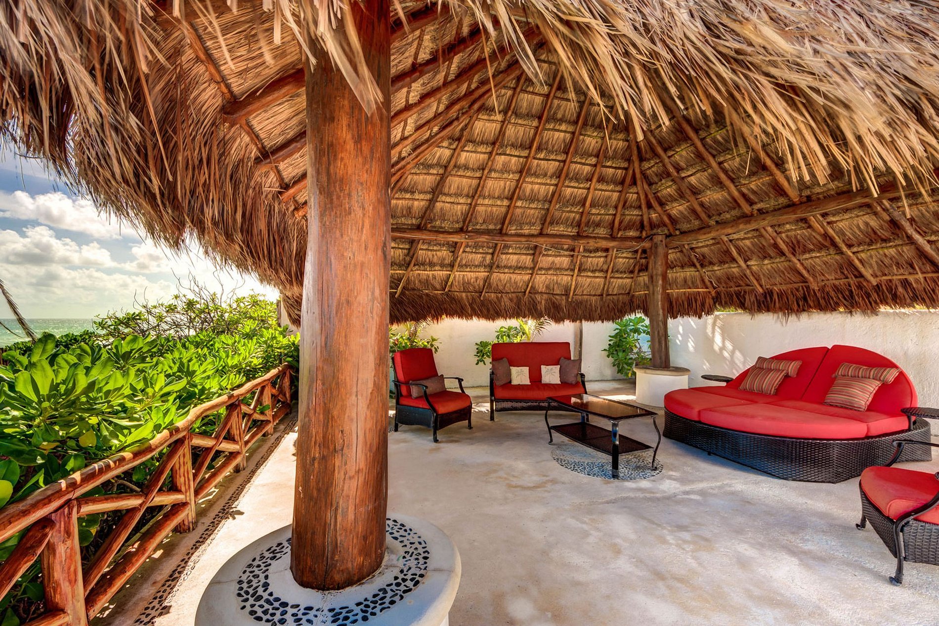 Pouvant accueillir jusqu'à 10 personnes, la villa dispose de cinq magnifiques chambres. Trois chambres offrent des salles de bains privatives avec jacuzzis, climatisation, coin salon et kitchenette. La quatrième chambre comprend une salle de bain attenante complète et deux lits jumeaux, avec un cadre de lit fabriqué à partir d'un tronc d'arbre naturel et de racines, ajoutant au charme d'inspiration caribéenne qui allie confort moderne et merveilles de la nature.