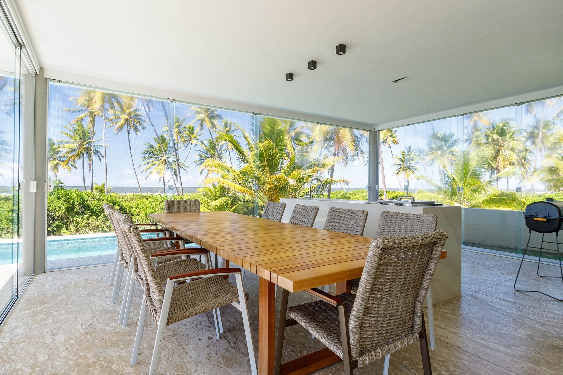 Ses deux salons disposent de 2 grands canapés, idéaux pour se retrouver entre amis pour profiter de films et de séries sur la grande smart TV et la grande piscine, les deux environnements disposent d'une table à manger pour 10 personnes.
