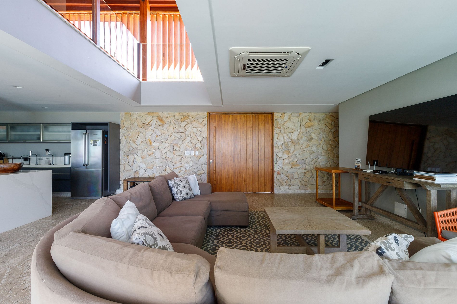 La maison a été conçue dans un concept à aire ouverte pour profiter au maximum de la lumière du soleil. Au premier étage de la maison se trouve le grand espace qui réunit 2 salons avec smart TV, 2 salles à manger et cuisine, tout l'environnement dispose de la climatisation centrale et d'une vue sur l'extérieur.