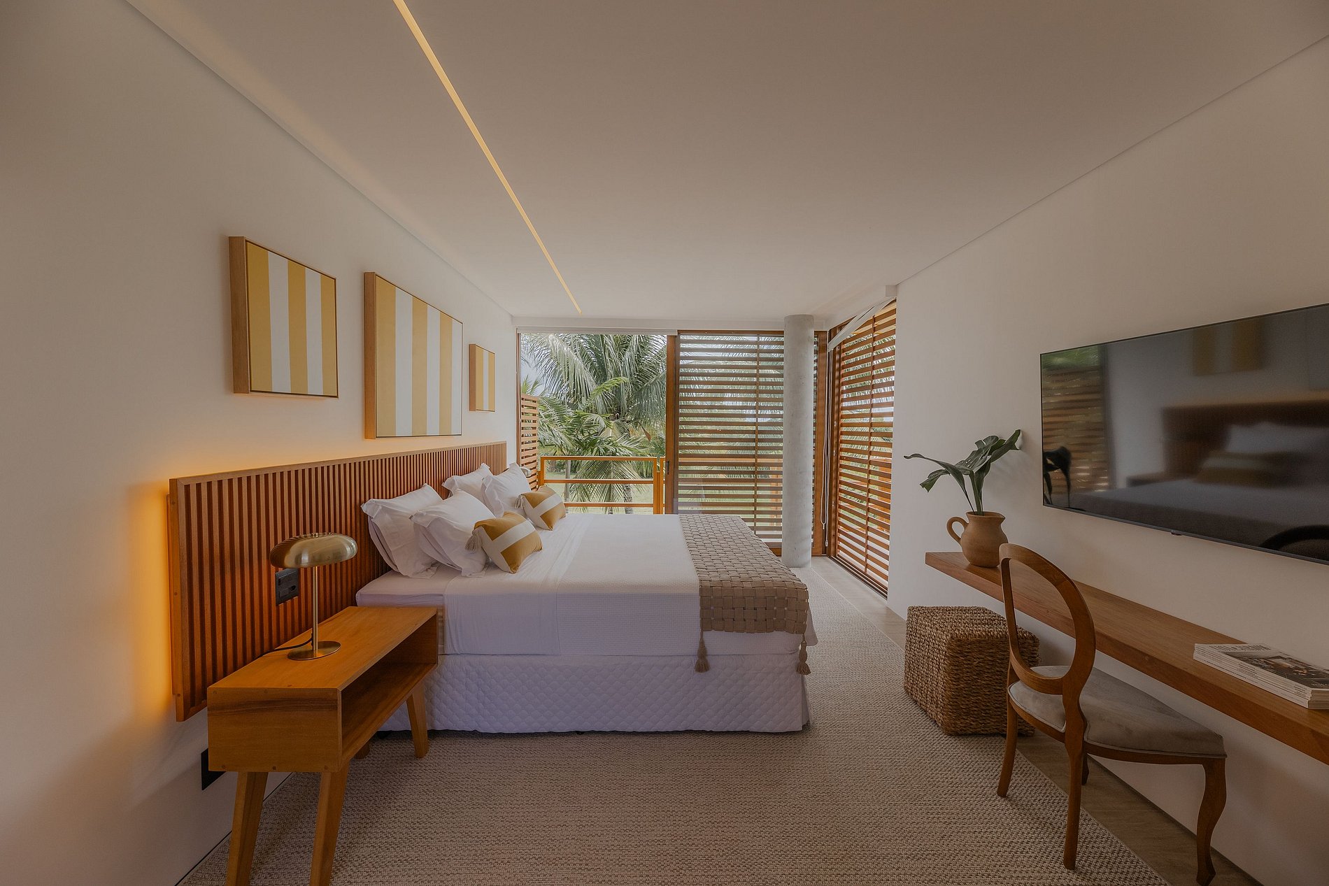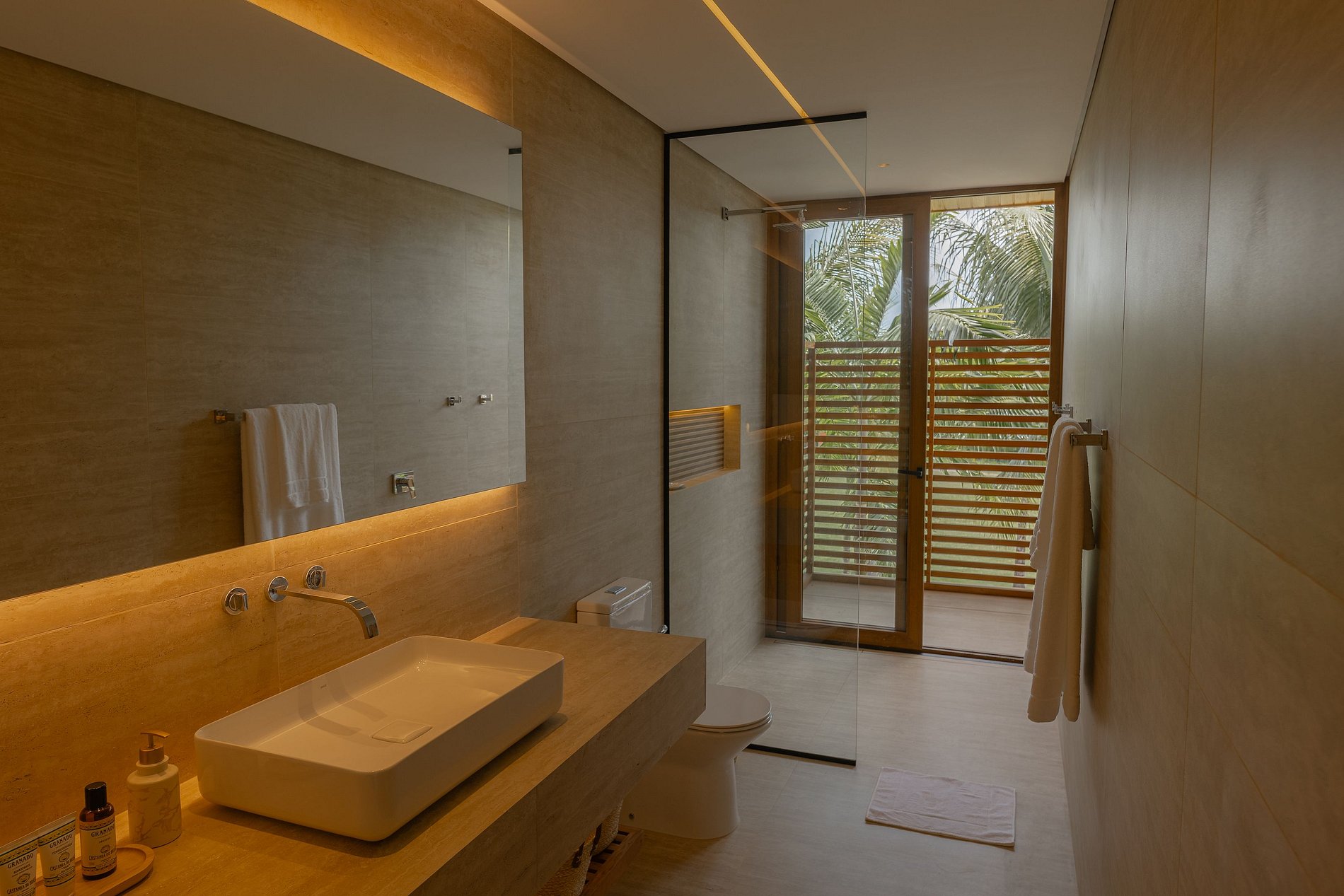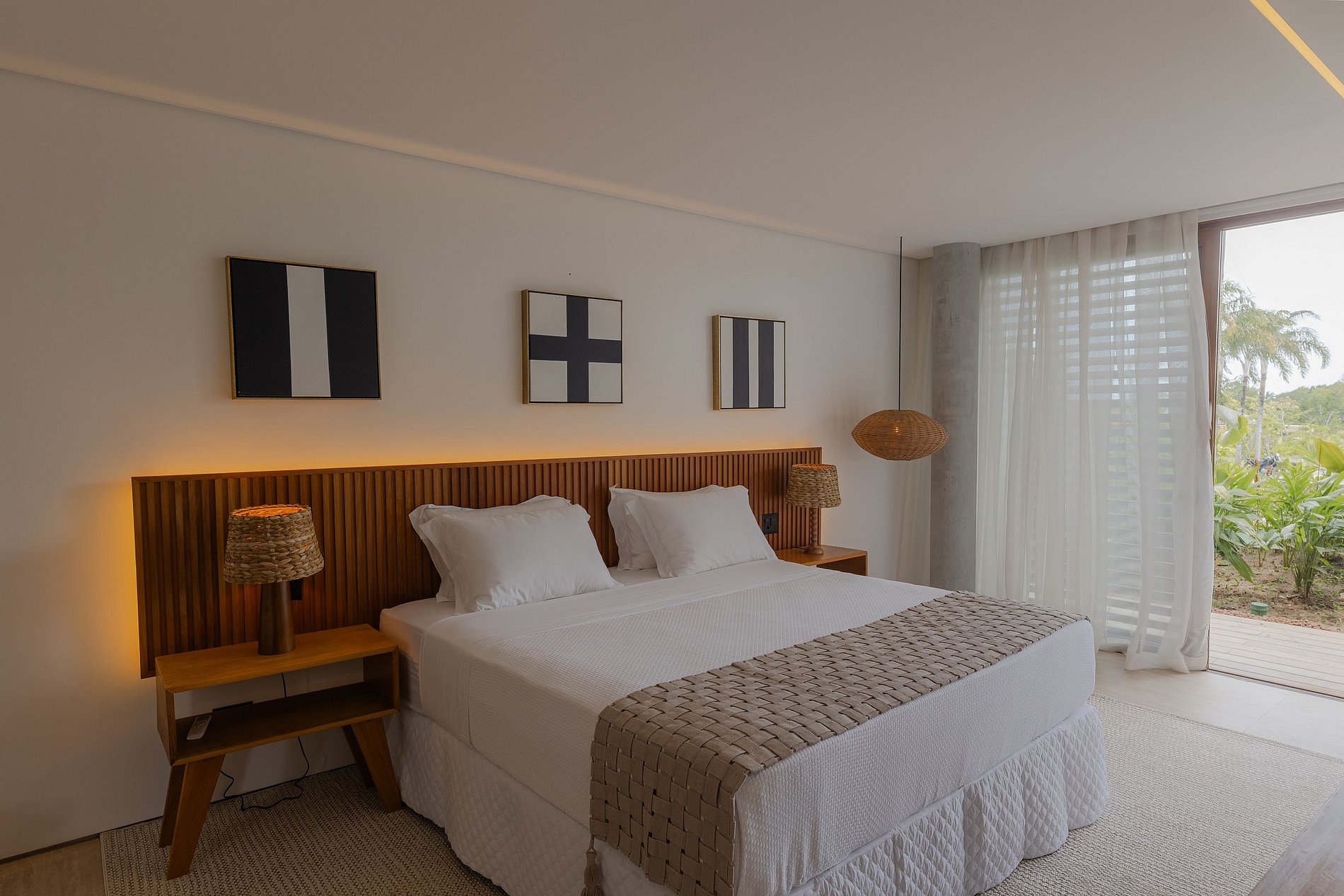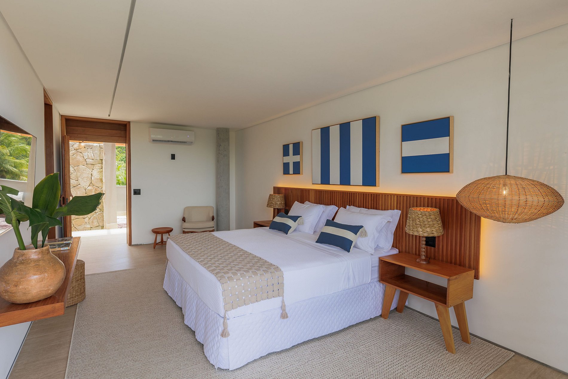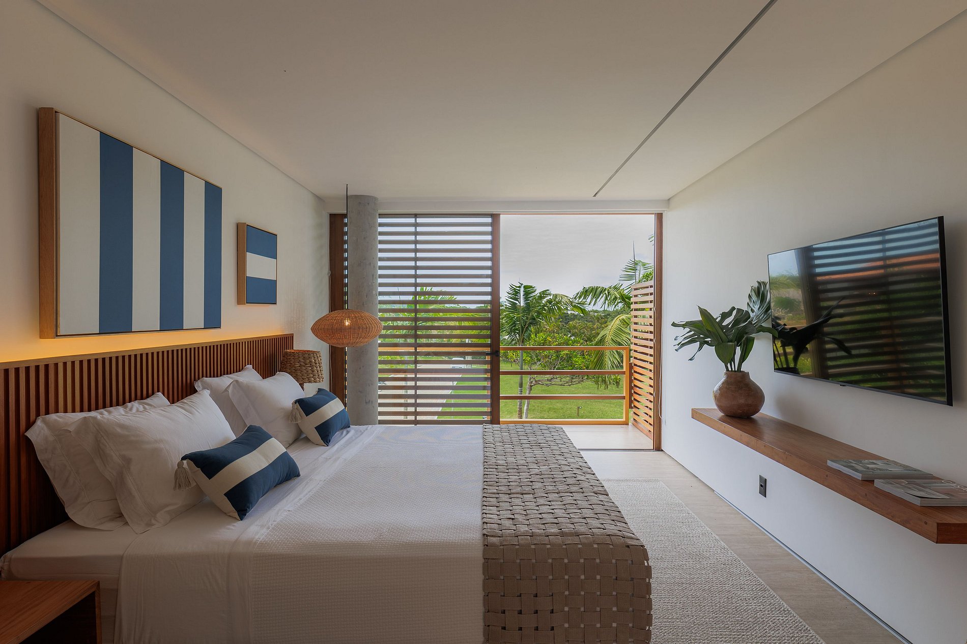La résidence a une façade de 30 m3 et un côté de 40 m, totalisant 70 m, et est répartie sur 2 étages, avec un garage couvert pour 2 voitures, hall d'entrée, salon, home cinéma, salle à manger, grande cuisine, buanderie. , 10 salles de bains (dont celles des suites). L'espace extérieur se compose d'une cuisine gastronomique,