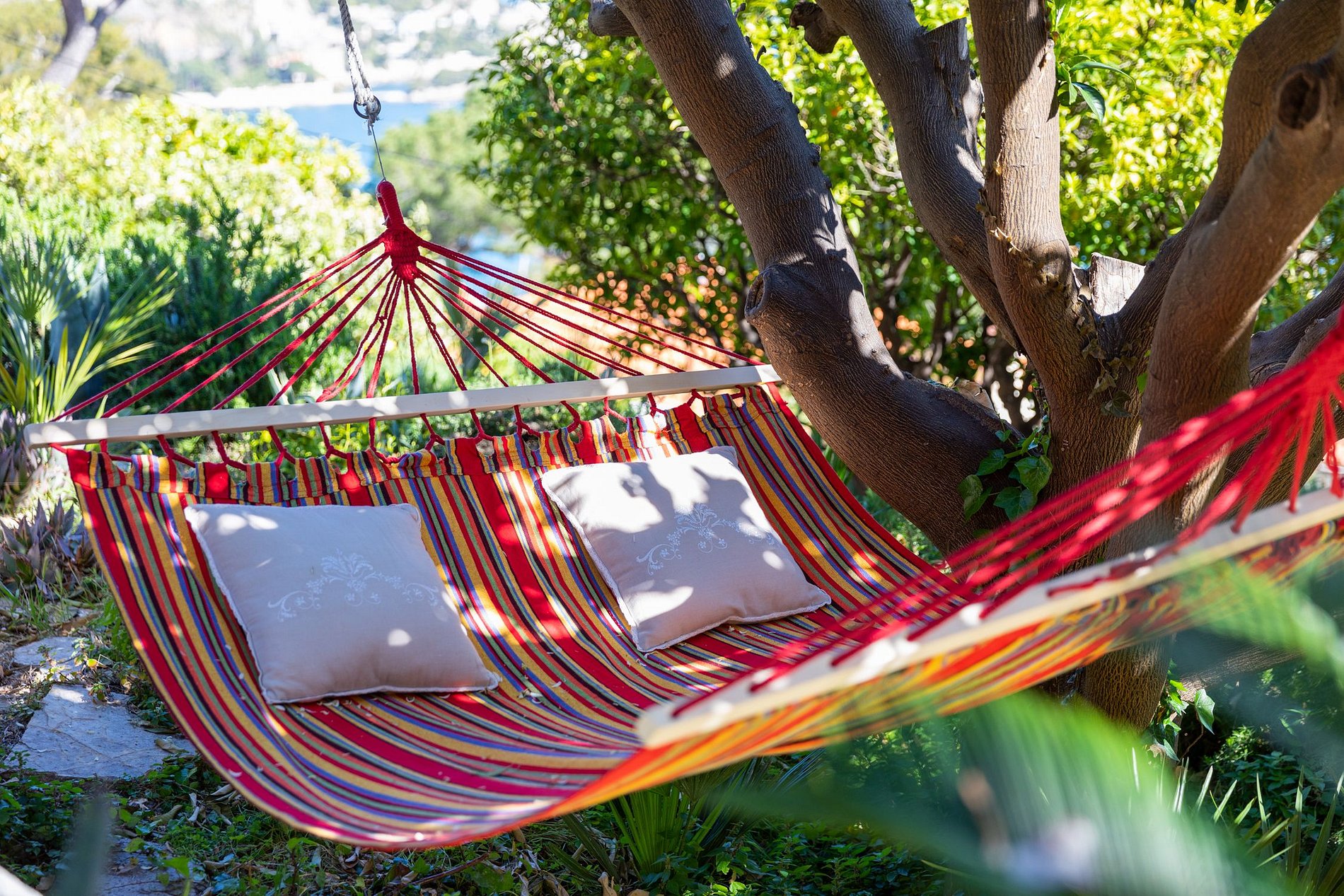 À seulement cinq minutes à pied de la plage, les terrasses exposées au sud donnent sur le jardin méditerranéen avec une vue panoramique sur la mer, les falaises côtières et les montagnes. Plus de 1100 m2 entourés d'une végétation tropicale, d'orangers et de pins parfumés, c'est un environnement de vacances idéal, paisible et relaxant.