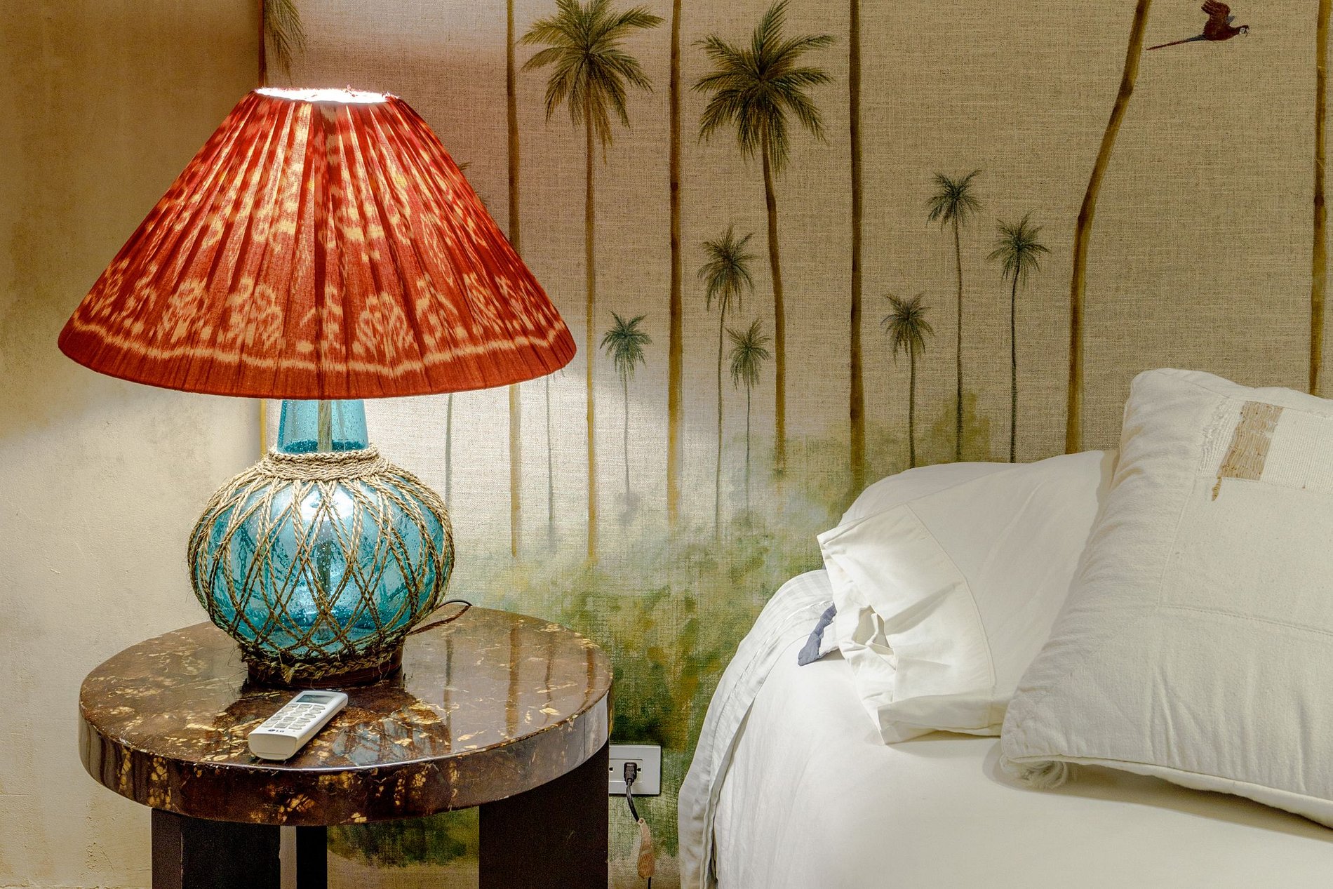 Le salon principal est un espace impressionnant, doté d’une décoration colorée mêlant des éléments artisanaux, coloniaux et des finitions modernes. Le papier peint à motifs de palmiers ajoute une ambiance tropicale, tandis que les matériaux rustiques et en bois complètent le mobilier élégant tapissé de beige. Un grand canapé central, des fauteuils et une table basse créent une atmosphère chaleureuse et sophistiquée. De grandes fenêtres offrent de magnifiques vues sur la rue animée en contrebas.