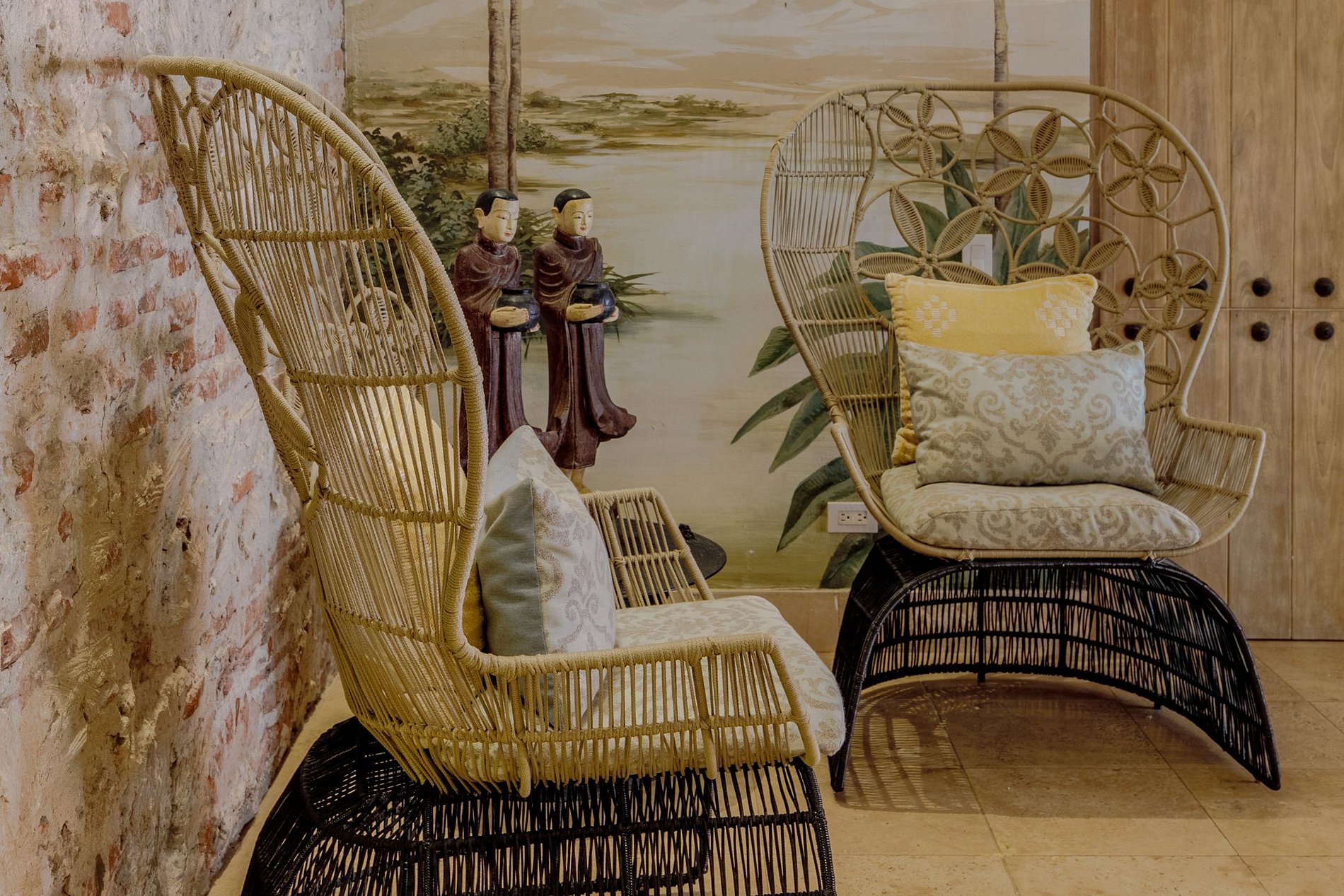 Le salon principal est un espace impressionnant, doté d’une décoration colorée mêlant des éléments artisanaux, coloniaux et des finitions modernes. Le papier peint à motifs de palmiers ajoute une ambiance tropicale, tandis que les matériaux rustiques et en bois complètent le mobilier élégant tapissé de beige. Un grand canapé central, des fauteuils et une table basse créent une atmosphère chaleureuse et sophistiquée. De grandes fenêtres offrent de magnifiques vues sur la rue animée en contrebas.