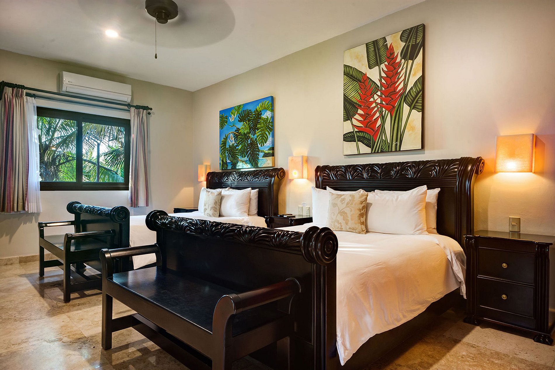 Il y a cinq chambres climatisées conçues artistiquement avec des plafonds de 14 pieds à l'intérieur de la villa; 2 chambres sont meublées avec 2 lits queen-size, deux chambres sont meublées avec 1 lit king-size et 1 chambre est meublée avec 1 lit queen-size. Il y a aussi 4 belles maisons d'hôtes situées à l'extérieur; 2 des maisons d'hôtes sont meublées avec 2 lits king-size et les 2 autres maisons d'hôtes ont chacune 1 lit king-size. Chacune des 9 chambres est équipée de ventilateurs de plafond, d'une télévision par satellite, d'un lecteur DVD et d'un coffre-fort. Ce magnifique décor de maison a été inspiré par l'architecture et l'artisanat mexicains. Chaque chambre a sa luxueuse salle de bain privée en marbre et la salle de bain principale dispose d'une baignoire jacuzzi avec une vue incroyable sur les Caraïbes.