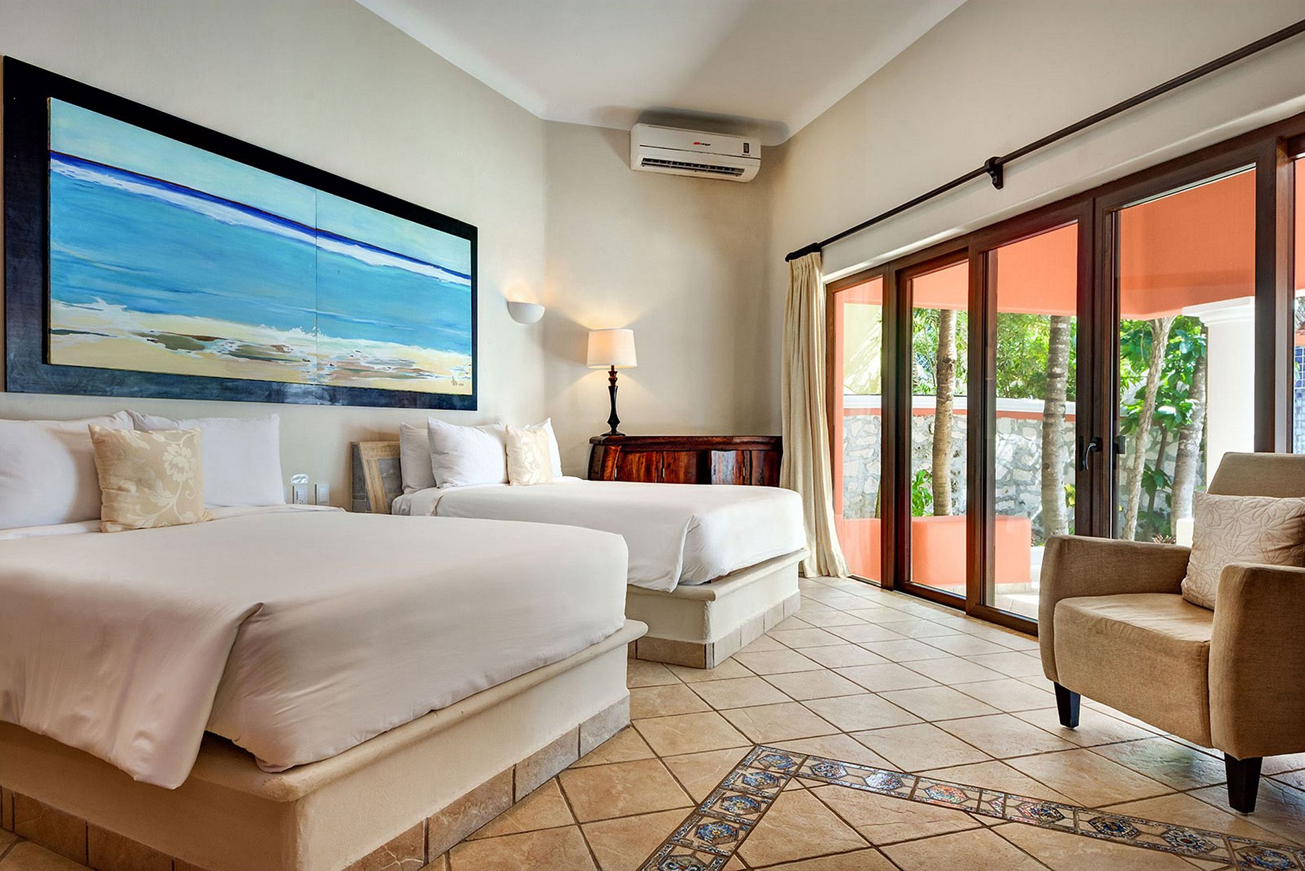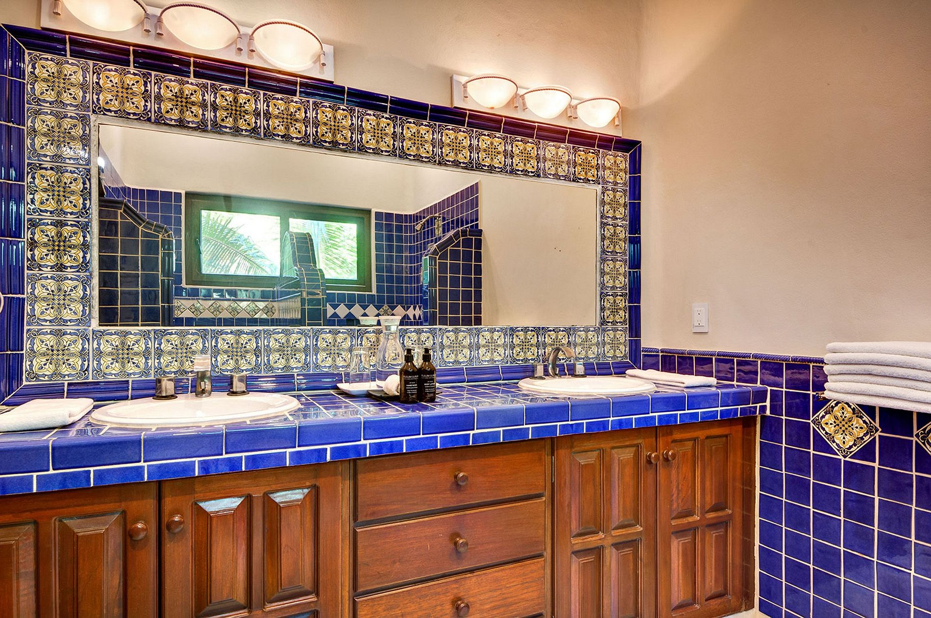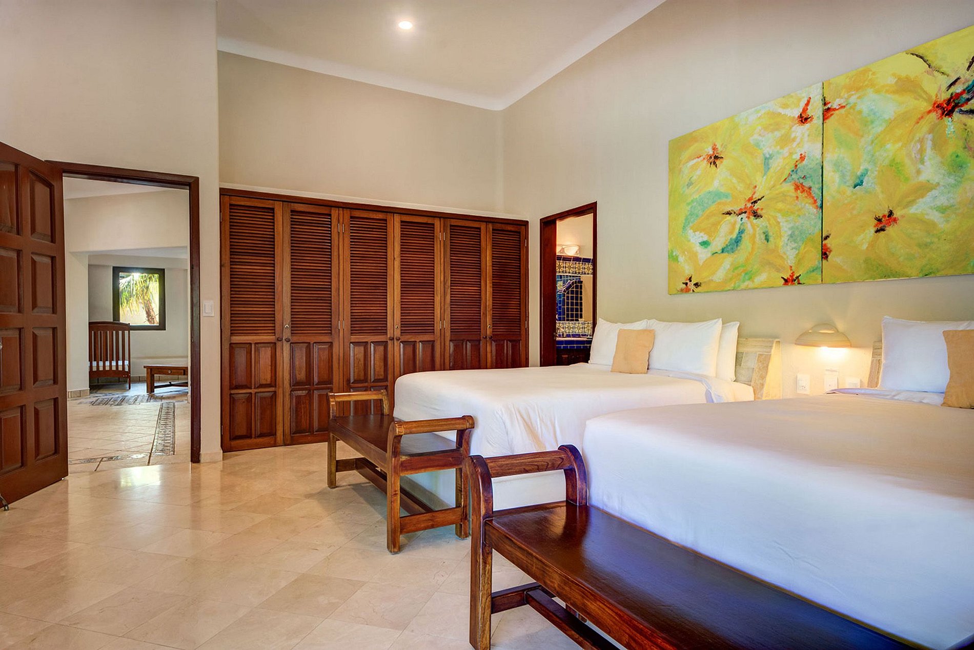 Il y a cinq chambres climatisées conçues artistiquement avec des plafonds de 14 pieds à l'intérieur de la villa; 2 chambres sont meublées avec 2 lits queen-size, deux chambres sont meublées avec 1 lit king-size et 1 chambre est meublée avec 1 lit queen-size. Il y a aussi 4 belles maisons d'hôtes situées à l'extérieur; 2 des maisons d'hôtes sont meublées avec 2 lits king-size et les 2 autres maisons d'hôtes ont chacune 1 lit king-size. Chacune des 9 chambres est équipée de ventilateurs de plafond, d'une télévision par satellite, d'un lecteur DVD et d'un coffre-fort. Ce magnifique décor de maison a été inspiré par l'architecture et l'artisanat mexicains. Chaque chambre a sa luxueuse salle de bain privée en marbre et la salle de bain principale dispose d'une baignoire jacuzzi avec une vue incroyable sur les Caraïbes.