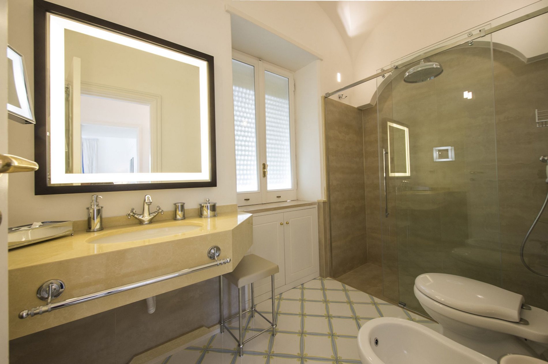 Cette villa de 3 étages se compose de 5 chambres et 5 ½ salles de bains, avec 2 chambres doubles au premier étage et 3 au deuxième, et peut accueillir jusqu'à 10 personnes. L'entrée de la villa se fait par un petit hall, qui mène à un grand salon double et à la salle à manger avec une table à manger en verre pour 8 personnes. Il y a aussi une salle à manger extérieure couverte avec une longue table à manger en céramique pour 10 personnes, située à côté d'un four à pizza en bois et d'une peinture de carreaux de céramique de Capri en toile de fond.