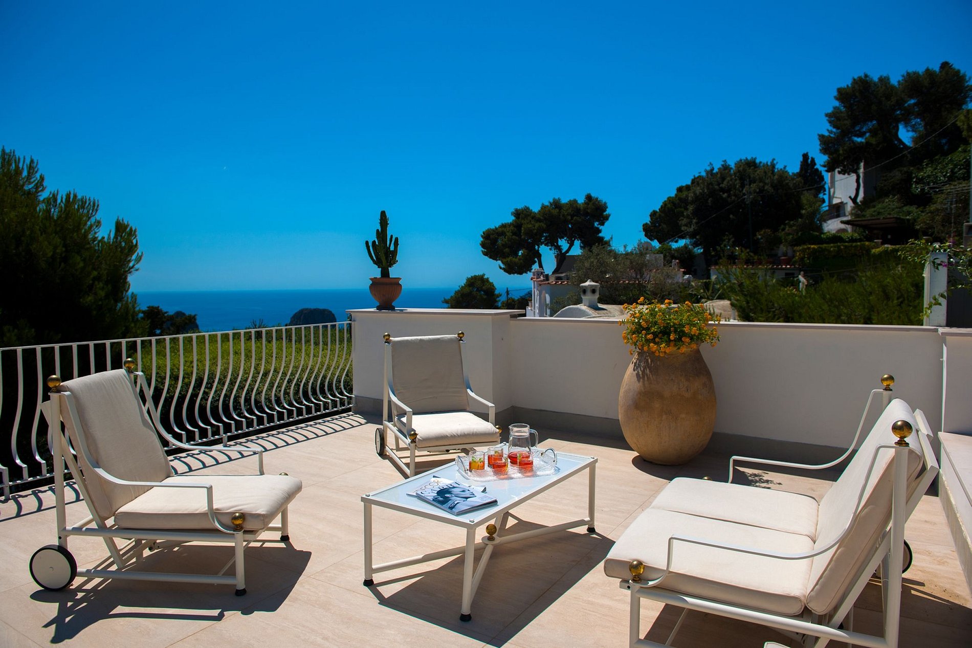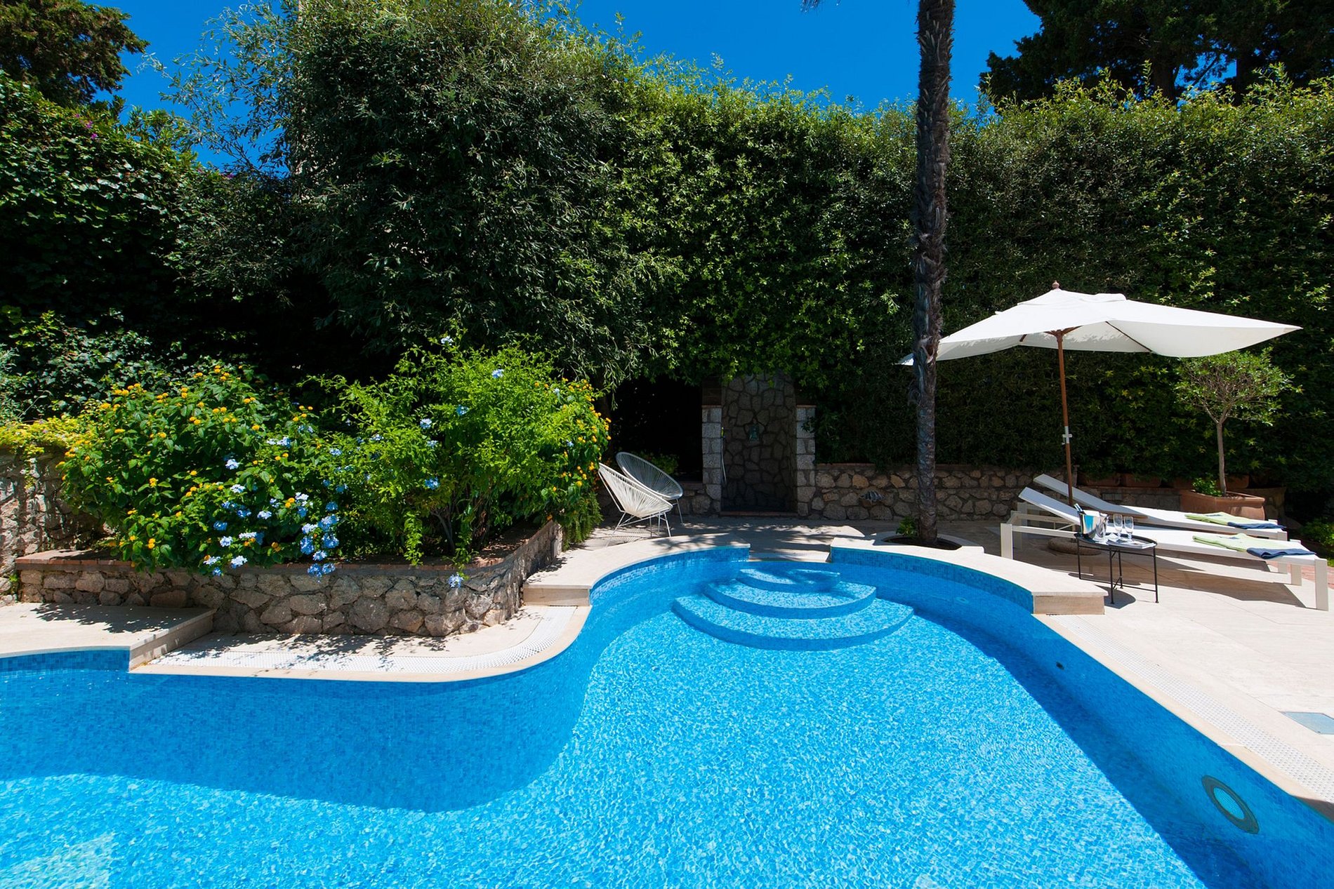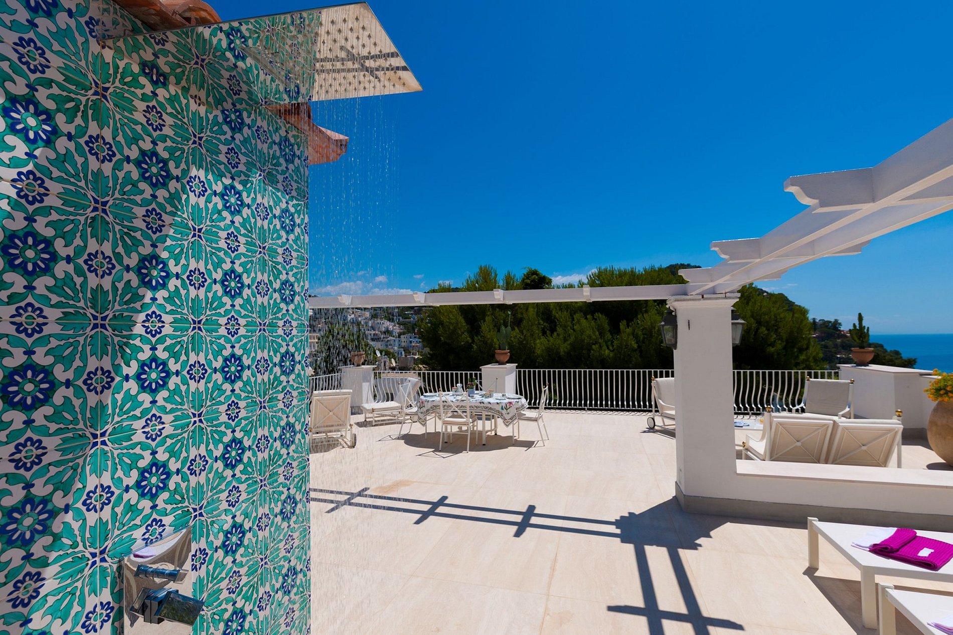 Le toit-terrasse, situé à 20 marches du deuxième étage, bénéficie de divers coins salon avec chaises longues et canapés, une table à manger ovale pour 4, des tables basses et de superbes vues sur la ville de Capri et les fameux rochers Faraglioni. La terrasse bénéficie également de deux douches extérieures, de jolies pièces de décoration et de nombreuses variétés de fleurs. La terrasse de la piscine, située à l'avant de la maison, est équipée de chaises longues et d'un vestiaire.