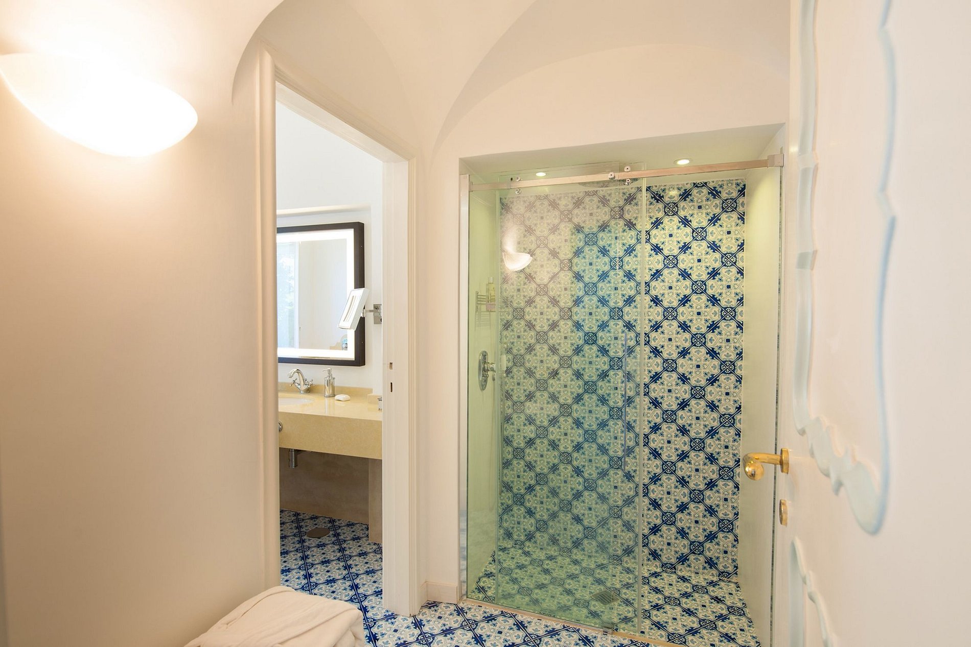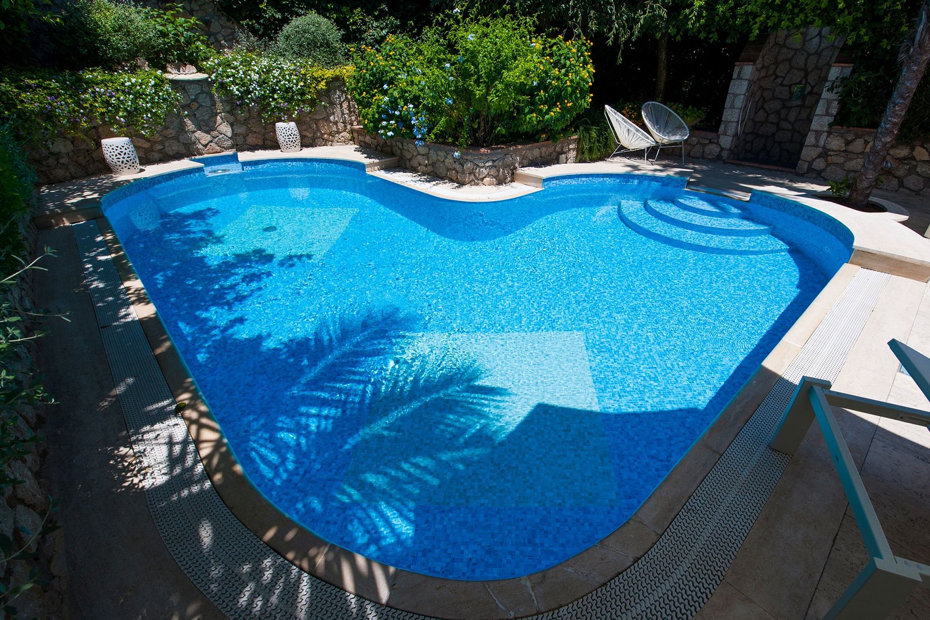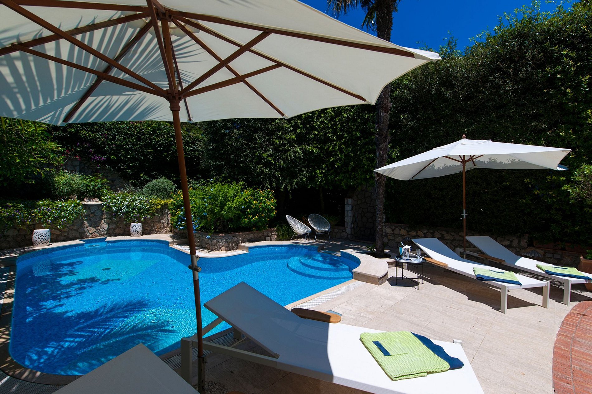 Le toit-terrasse, situé à 20 marches du deuxième étage, bénéficie de divers coins salon avec chaises longues et canapés, une table à manger ovale pour 4, des tables basses et de superbes vues sur la ville de Capri et les fameux rochers Faraglioni. La terrasse bénéficie également de deux douches extérieures, de jolies pièces de décoration et de nombreuses variétés de fleurs. La terrasse de la piscine, située à l'avant de la maison, est équipée de chaises longues et d'un vestiaire.