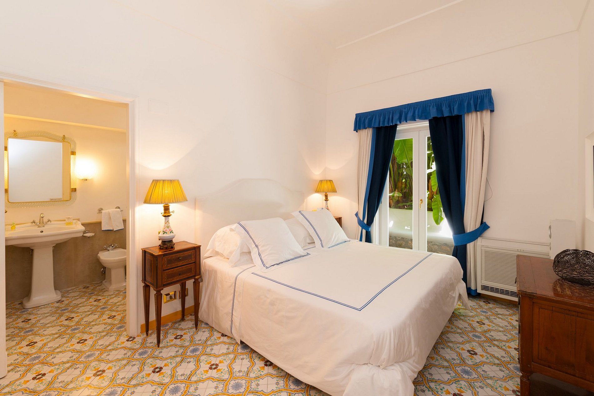 Cette villa de 3 étages se compose de 5 chambres et 5 ½ salles de bains, avec 2 chambres doubles au premier étage et 3 au deuxième, et peut accueillir jusqu'à 10 personnes. L'entrée de la villa se fait par un petit hall, qui mène à un grand salon double et à la salle à manger avec une table à manger en verre pour 8 personnes. Il y a aussi une salle à manger extérieure couverte avec une longue table à manger en céramique pour 10 personnes, située à côté d'un four à pizza en bois et d'une peinture de carreaux de céramique de Capri en toile de fond.