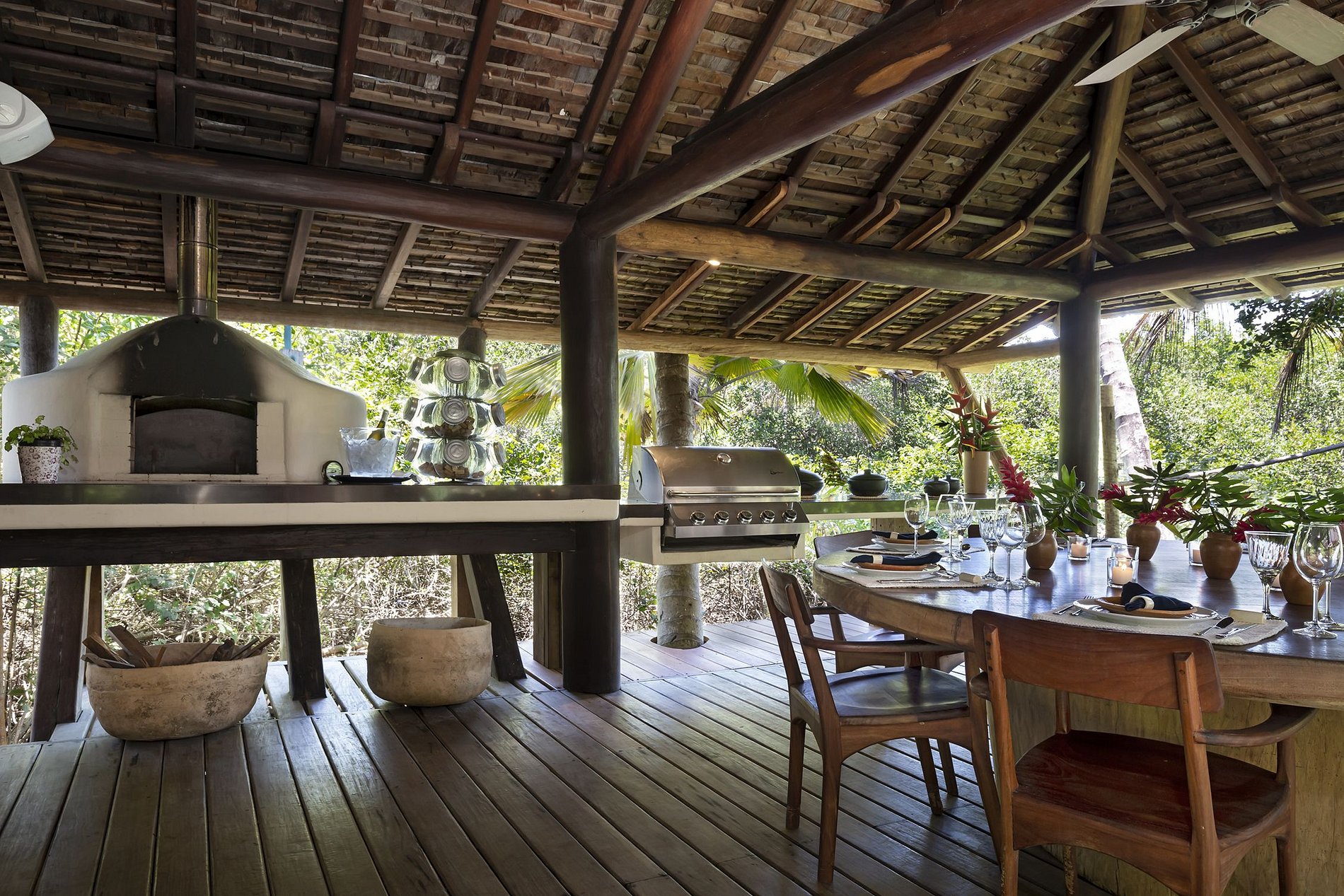 - cuisine complète, cellier, barbecue, table pour 10 personnes avec vue sur le lagon ;