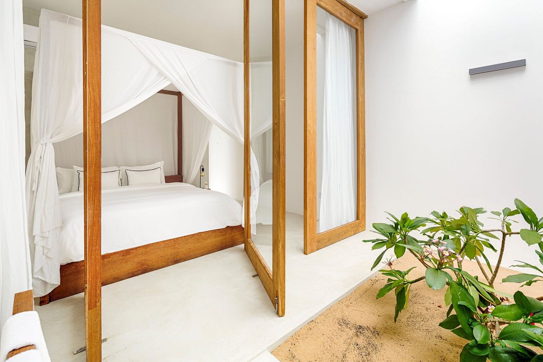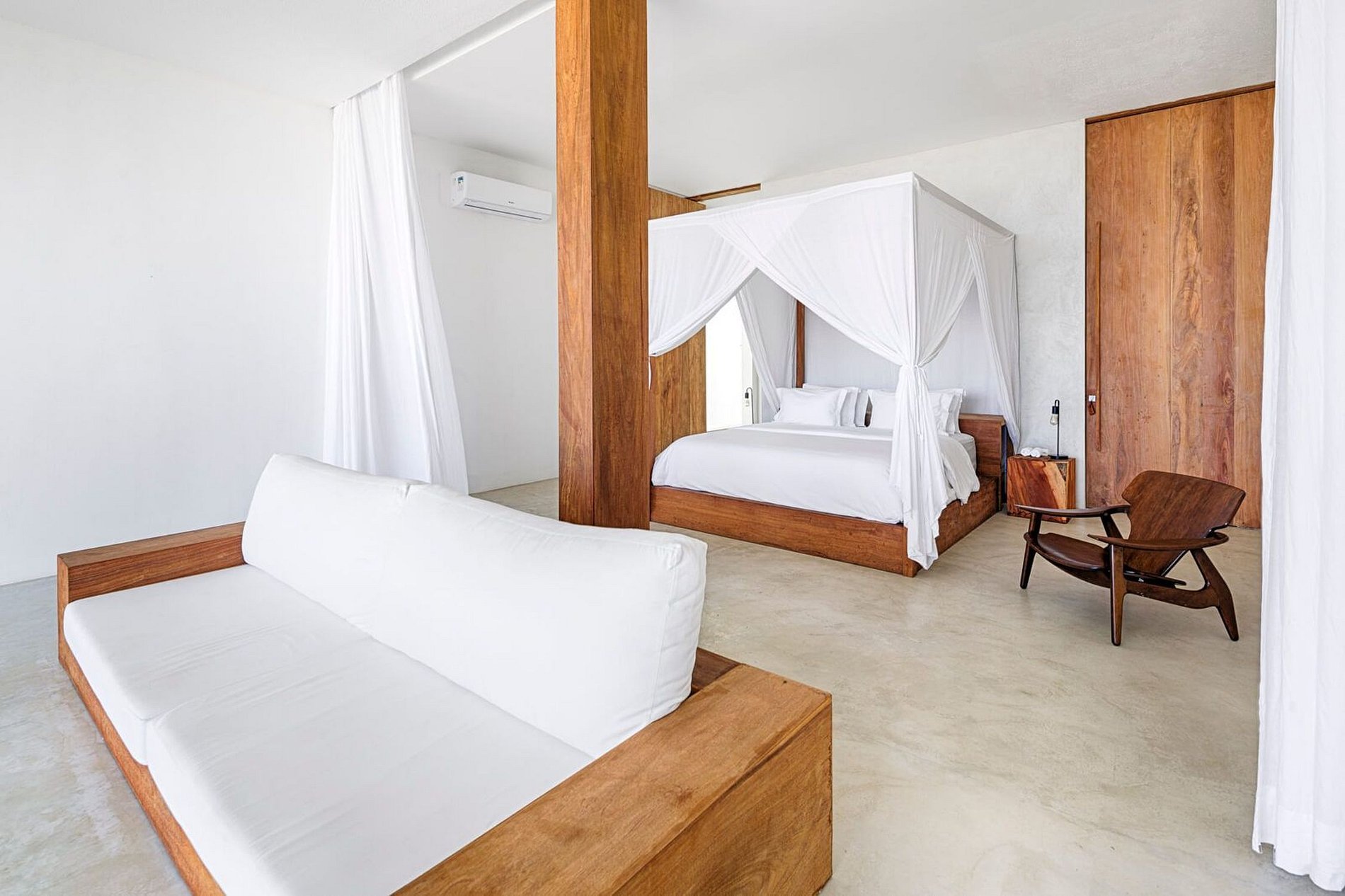 - Chambre principale : Cette suite face à la piscine dispose d'un lit king-size, de la climatisation, d'une armoire, d'un accès à la terrasse, au jardin et à la plage.