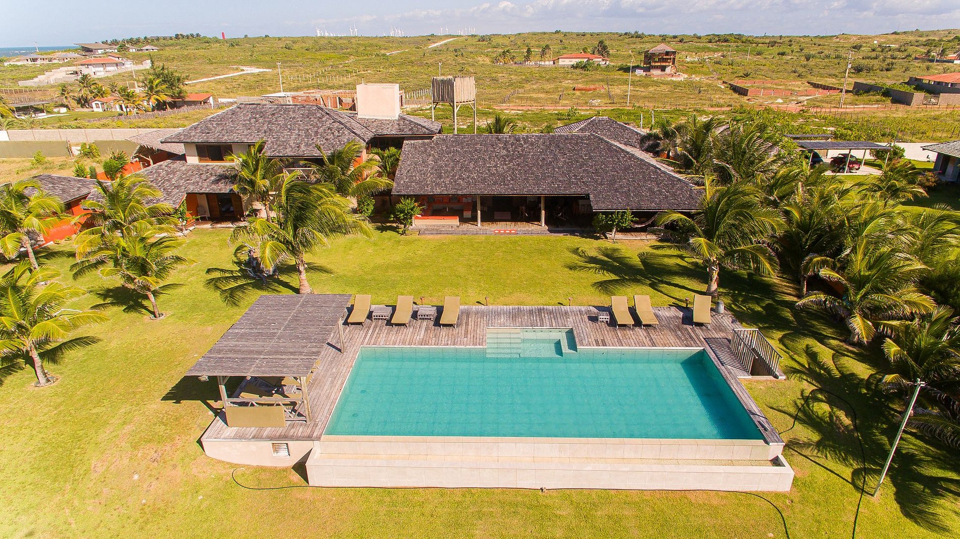 La villa a 600m² de surface bâtie, à commencer par le beau salon décoré de meubles en bois et d'éléments d'artisanat local. La salle est ouverte sur l'espace extérieur de la villa qui dispose de plusieurs hamacs pour se reposer et donne sur le grand jardin et la piscine autour de laquelle se trouve de confortables transats.