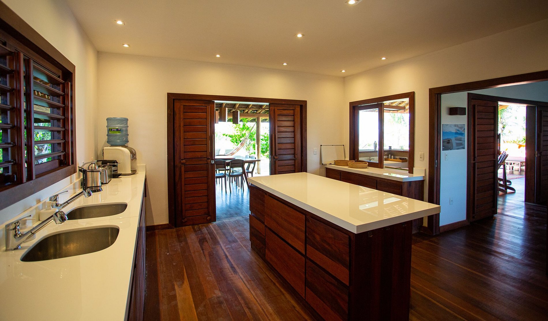 La cuisine donnant également sur l'extérieur, est ouverte sur le bar pour faciliter la circulation entre les 2 espaces et faciliter l'organisation des repas sur la terrasse. Elle possède un îlot central pour une cuisine conviviale.
