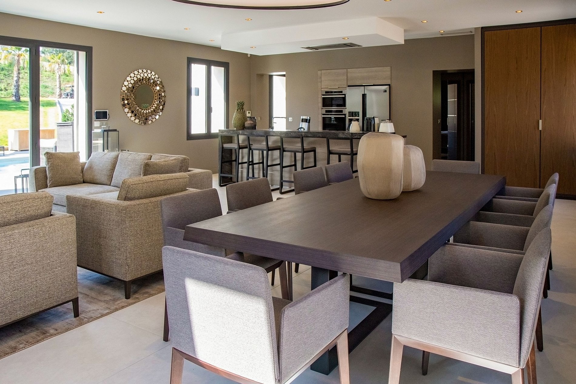 Cette Villa comprend 320m2 d'espace intérieur, deux résidences avec une piscine chauffée bordée de romarin et un parc aux allées de palmiers et d'oliviers offrant un séjour calme et parfait, en toute discrétion.