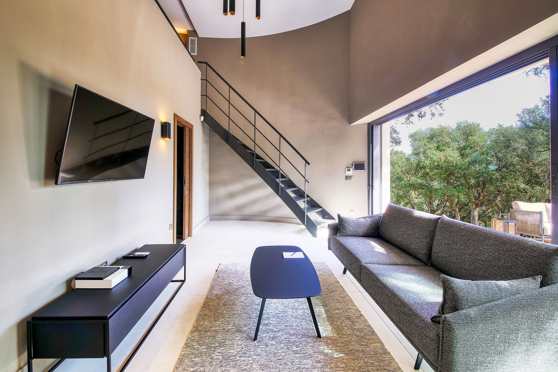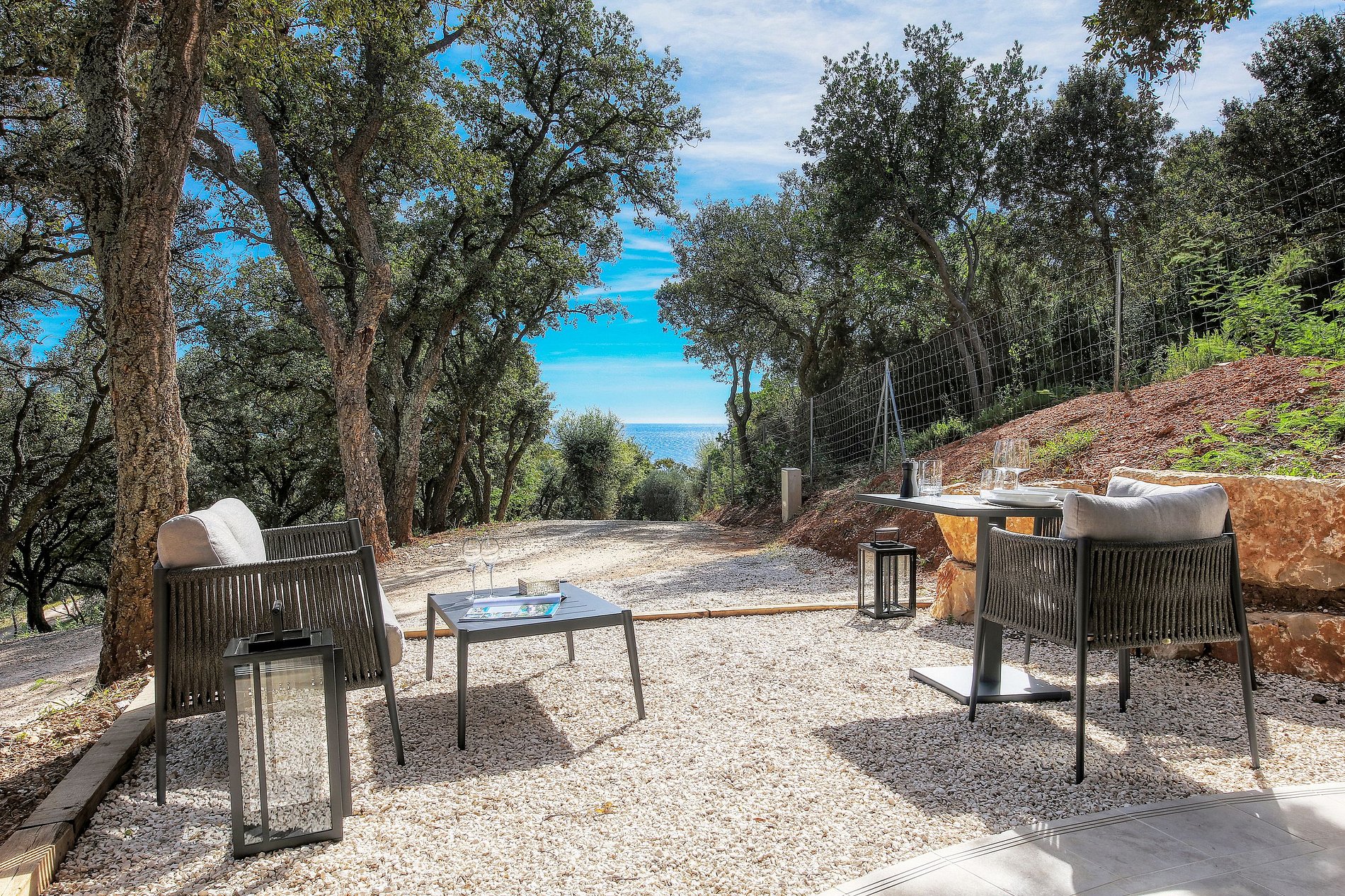 La villa située à La Croix-Valmer est une résidence intimiste et atypique, nichée au cœur du parc, au milieu des chênes et des oliviers avec vue sur la Méditerranée, ce qui en fait le lieu idéal pour un séjour discret proche de la nature.