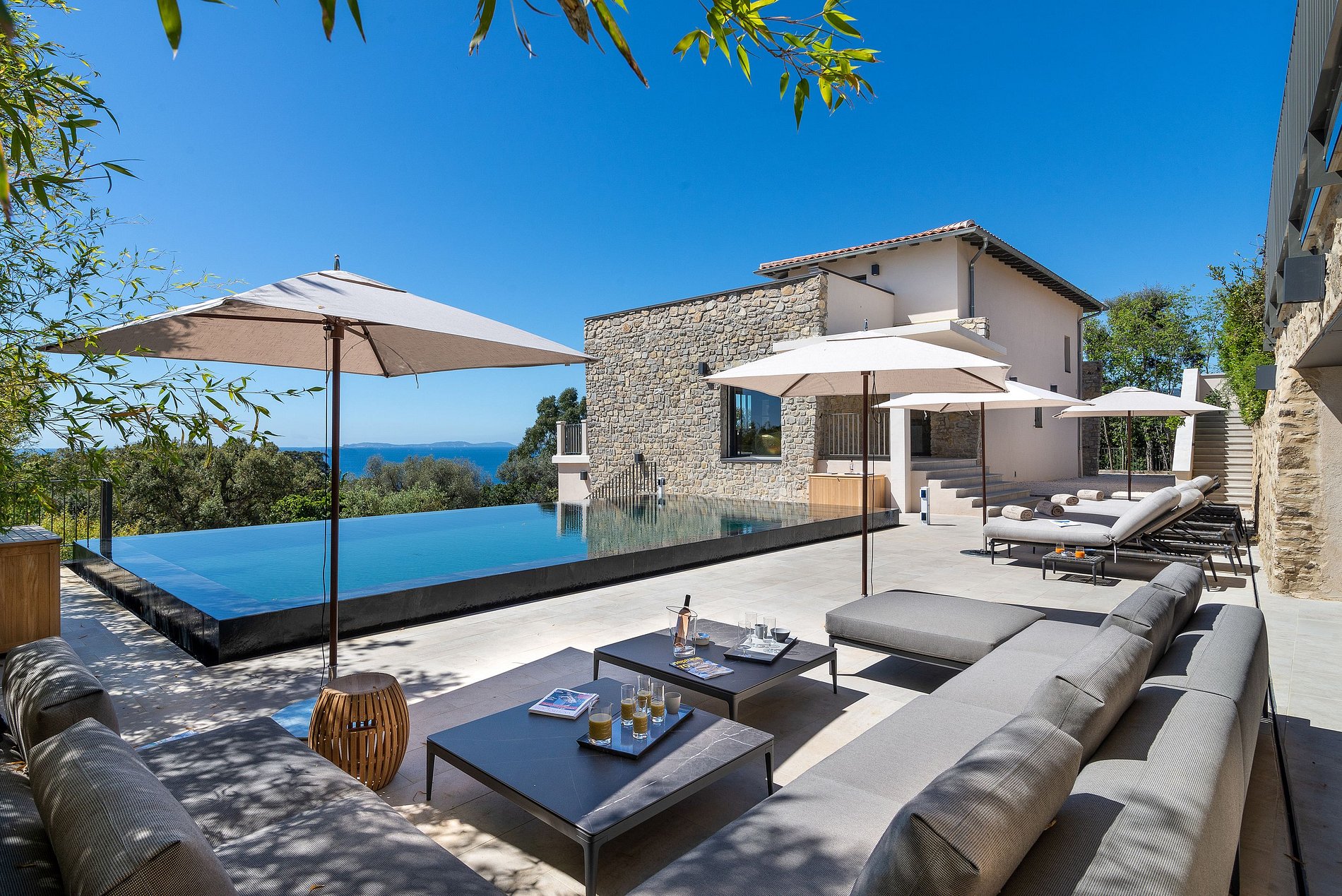 Villa de 390 m2 habitables intérieurs composée d'une résidence principale et de deux dépendances, d'une piscine chauffée à débordement avec un pool house et d'un jacuzzi sur le toit-terrasse. Vous apprécierez particulièrement sa vue panoramique sur la Méditerranée et les îles d'or ainsi que sa spacieuse terrasse d'été entièrement équipée.