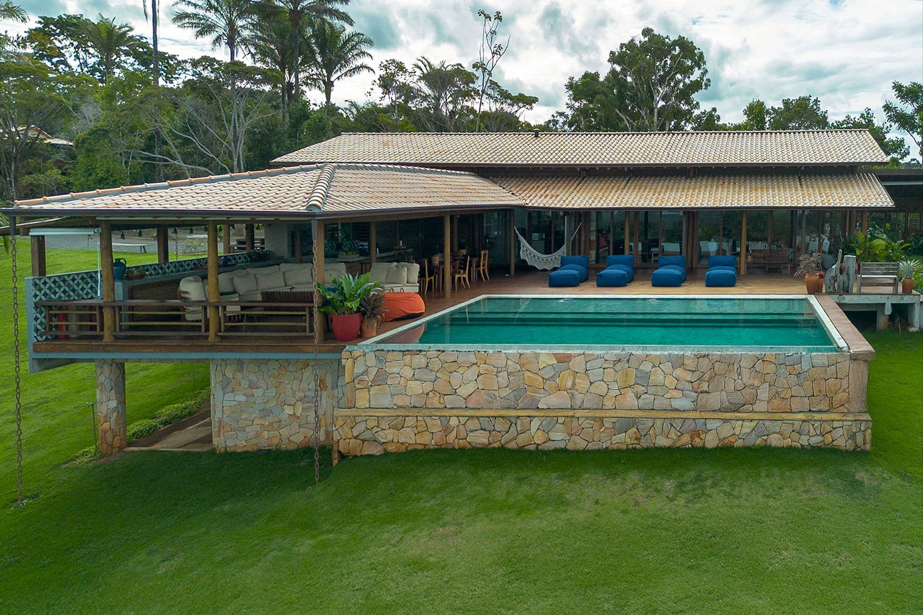 Hébergement : La maison principale comprend trois suites spacieuses (lits super king-size). Un beau salon avec canapés et fauteuils confortables invite à la conversation. Le salon donne sur la piscine, avec son carrelage vert en harmonie avec les couleurs environnantes. À côté se trouve une cuisine gastronomique avec un magnifique barbecue, un four à bois et une table à manger pour 16 personnes. Les deux bungalows indépendants, chacun dotés de deux chambres et d'une salle de bain, disposent d'un salon et d'un balcon avec vue sur l'océan et la forêt atlantique. Le pavillon polyvalent est idéal pour les cours de yoga, les événements ou les activités de loisirs, et est équipé d'une table de ping-pong, d'un billard et d'un baby-foot.