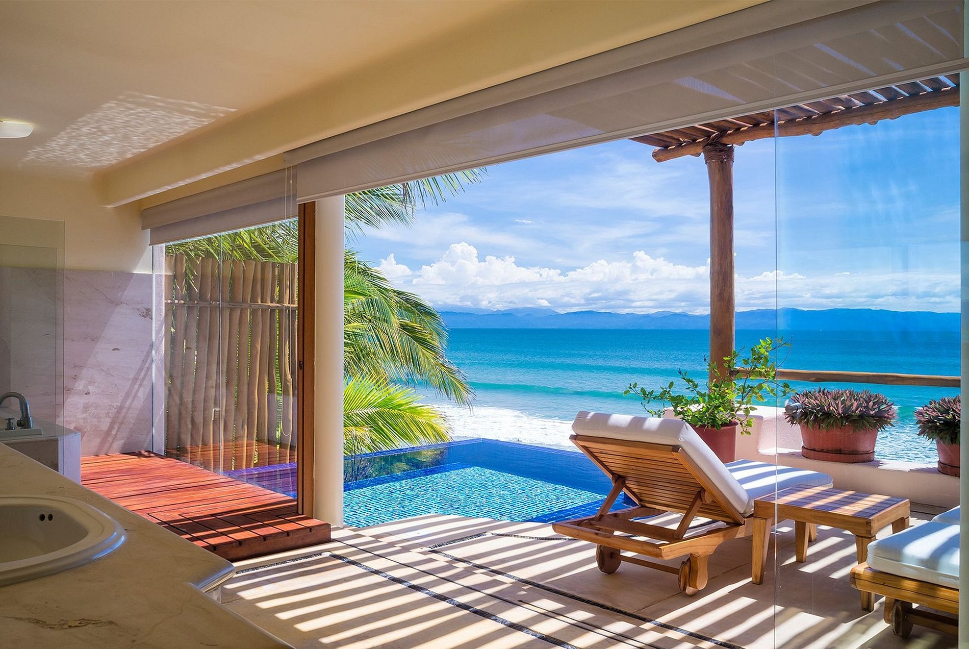 Lit king size, salon avec télévision, grande salle de bain ouverte avec terrasse et piscine privée avec vue sur la mer, jacuzzi et douche extérieure.