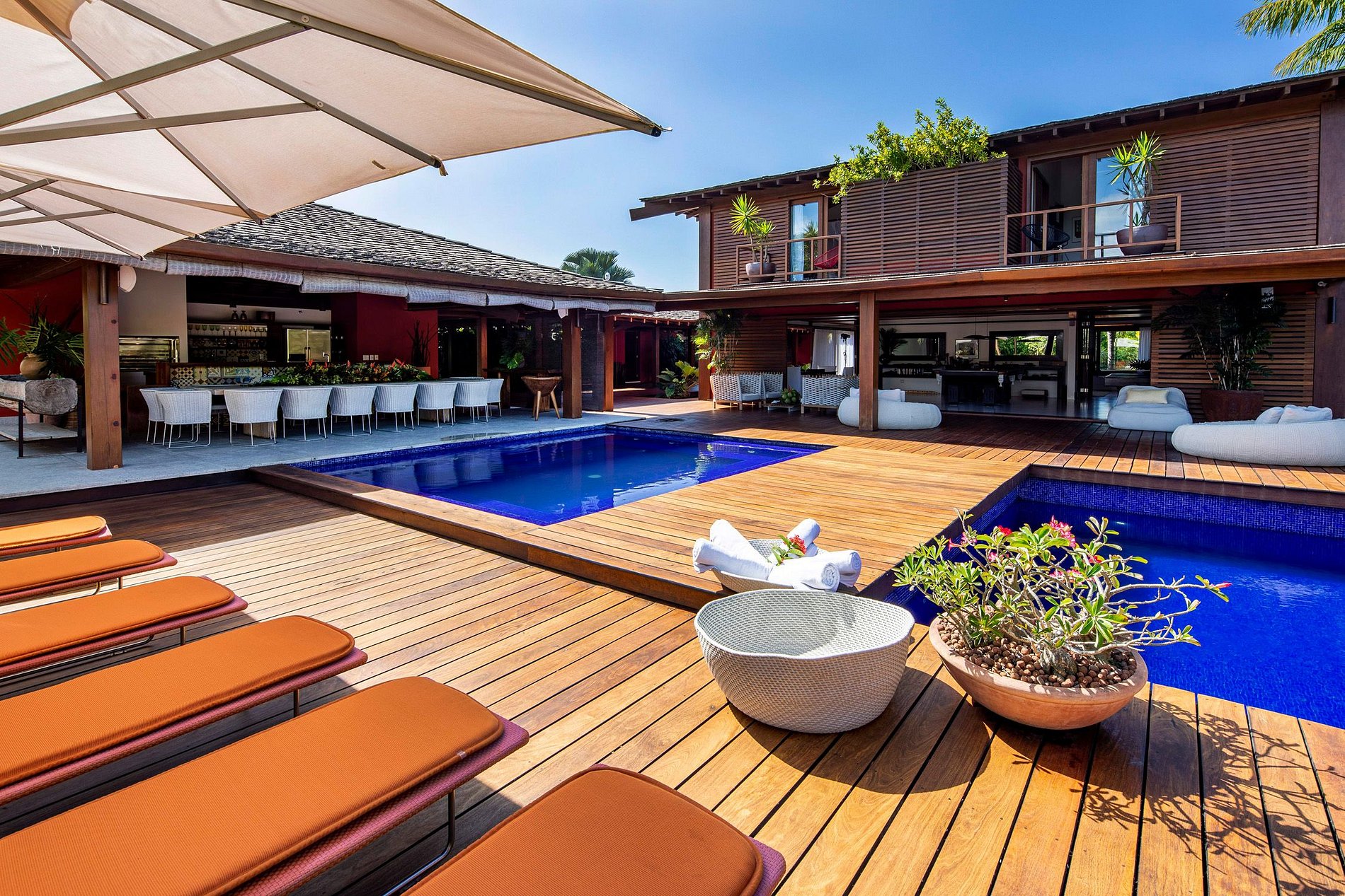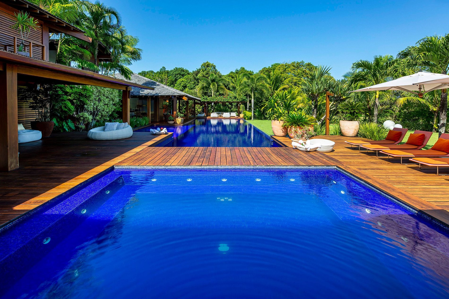 Les nombreuses zones de loisirs et les terrasses couvertes au-dessus de la piscine constituent le cadre idéal pour passer de bons moments en famille ou entre amis. La piscine gigantesque et le fantastique espace bain à remous ouvert reposent sur une magnifique terrasse qui apporte une touche de confort et une ambiance tropicale.