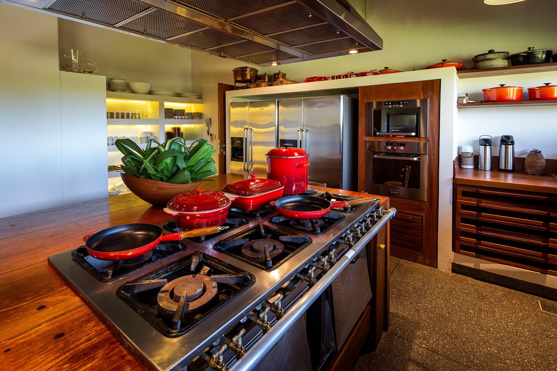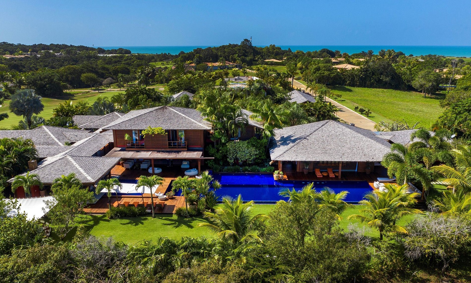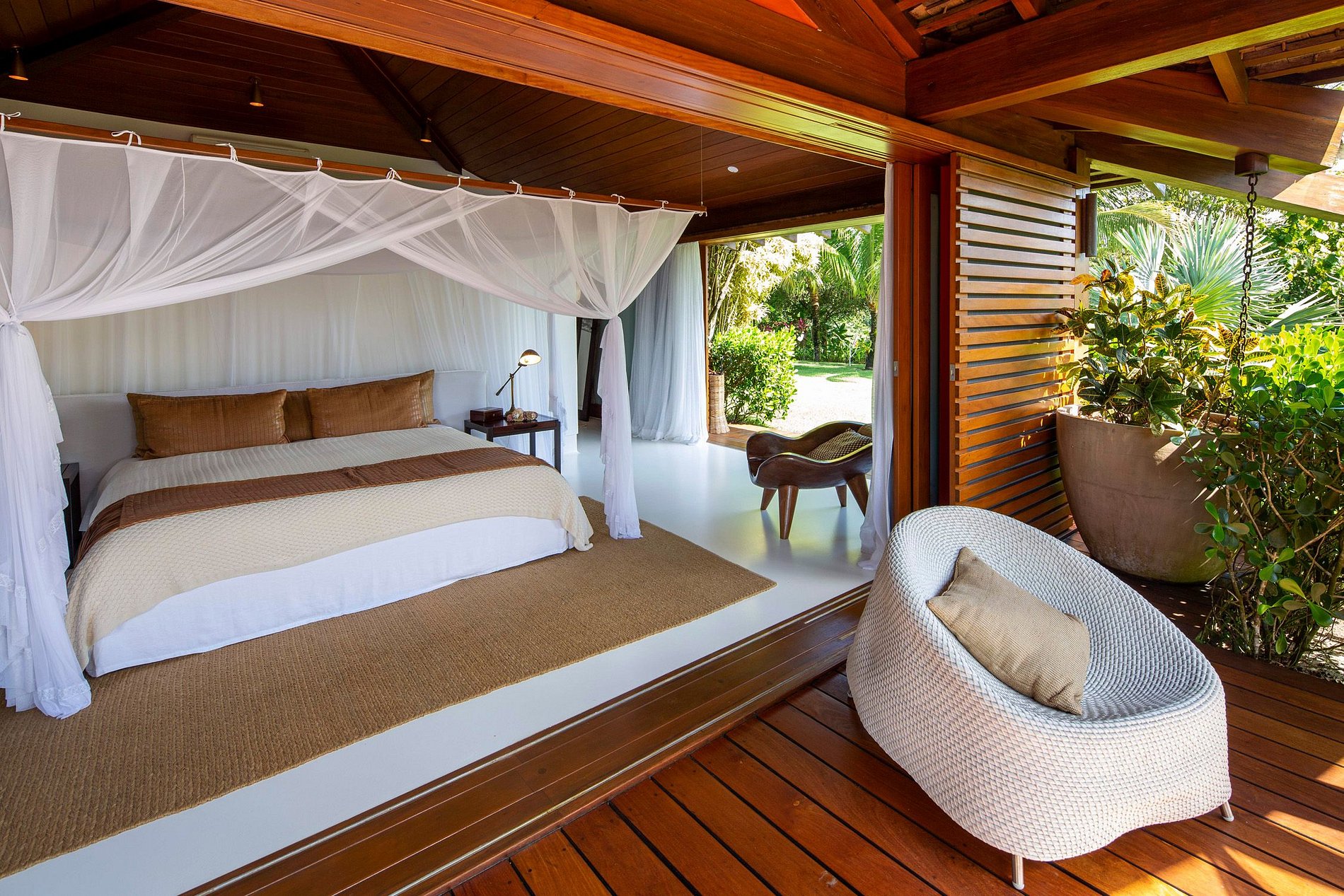 Les zones intimes et sociales sont reliées par des passerelles Cumaru protégées par des murs de verre impressionnants.