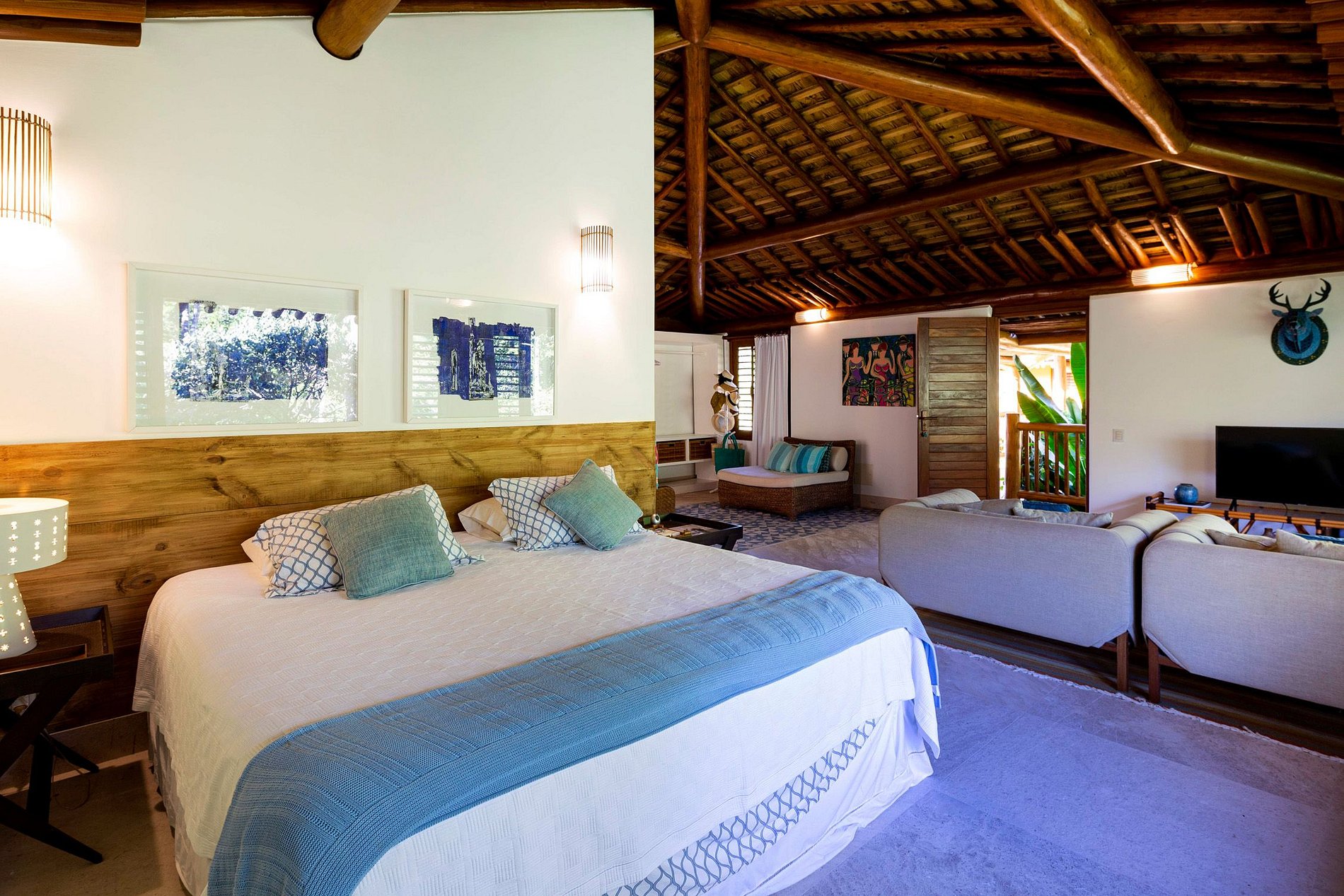 Master Suite: lit king size, air conditionné, zone de télévision, deux douches et bain à remous, vue sur le jardin et la piscine;