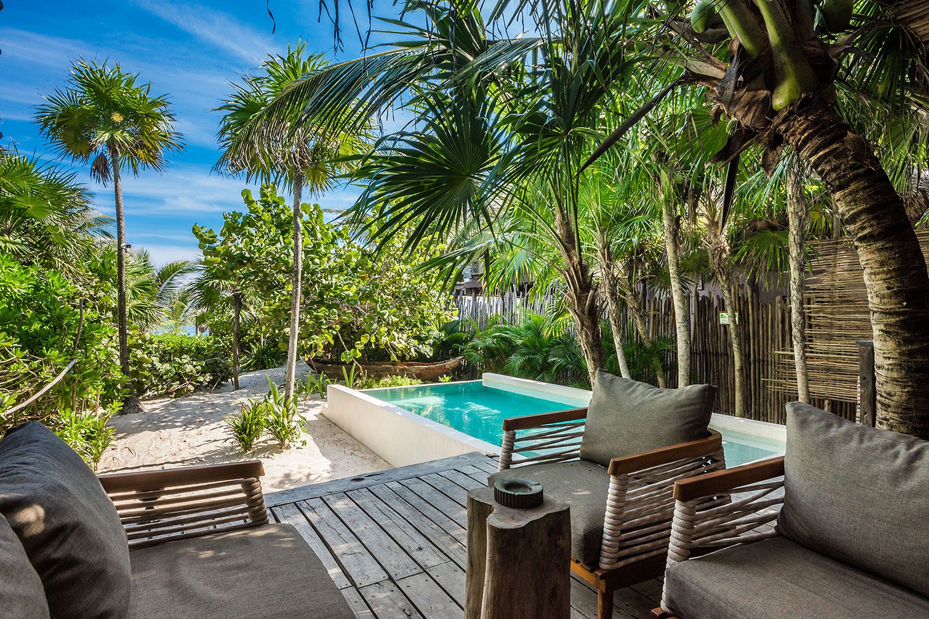 Alliant raffinement intérieur et végétation luxuriante extérieure, cette maison propose une villa décloisonnée avec vue sur le jardin et accès direct à la plage de Tulum. À travers de magnifiques sentiers entre la verdure de la propriété, les clients peuvent se promener pieds nus de la maison à une plage privée avec des chaises longues donnant sur la mer des Caraïbes.