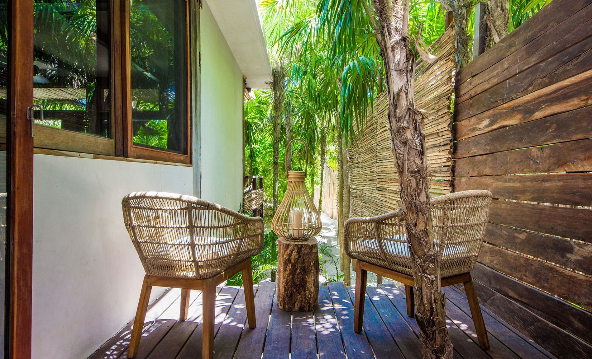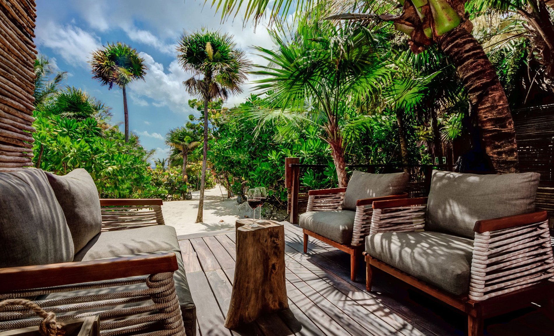 Alliant raffinement intérieur et végétation luxuriante extérieure, cette maison propose une villa décloisonnée avec vue sur le jardin et accès direct à la plage de Tulum. À travers de magnifiques sentiers entre la verdure de la propriété, les clients peuvent se promener pieds nus de la maison à une plage privée avec des chaises longues donnant sur la mer des Caraïbes.