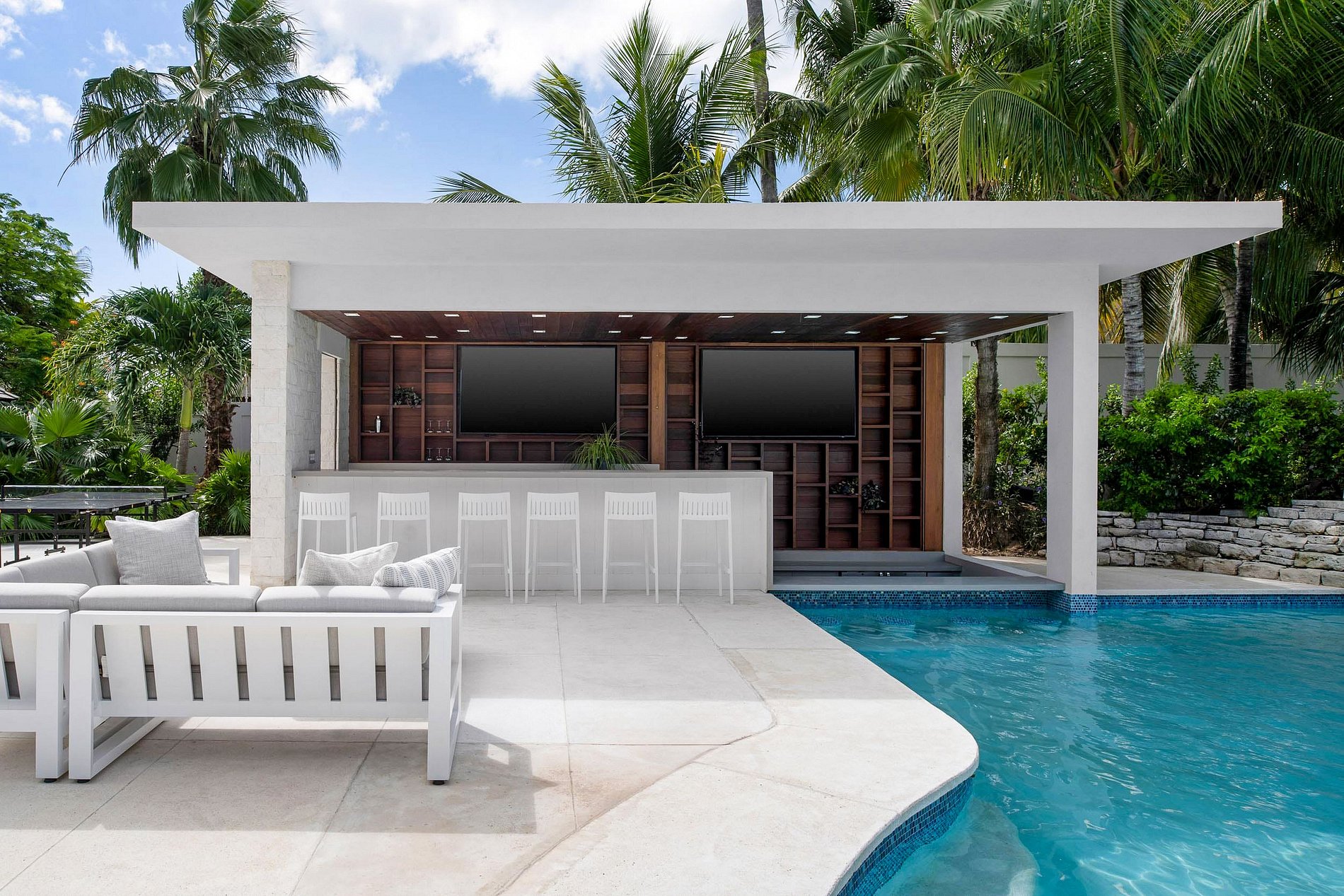 Que ce soit autour d’un dîner en plein air, d’un apéritif au coucher du soleil au bar de la piscine, ou d’un moment de détente dans la salle de jeux ou de cinéma, chaque espace est pensé pour un séjour fluide et agréable. Les extérieurs comprennent une piscine chauffée, un brasero, un four à pizza, et plusieurs espaces lounge nichés dans des jardins tropicaux, à seulement quelques pas de la plage.