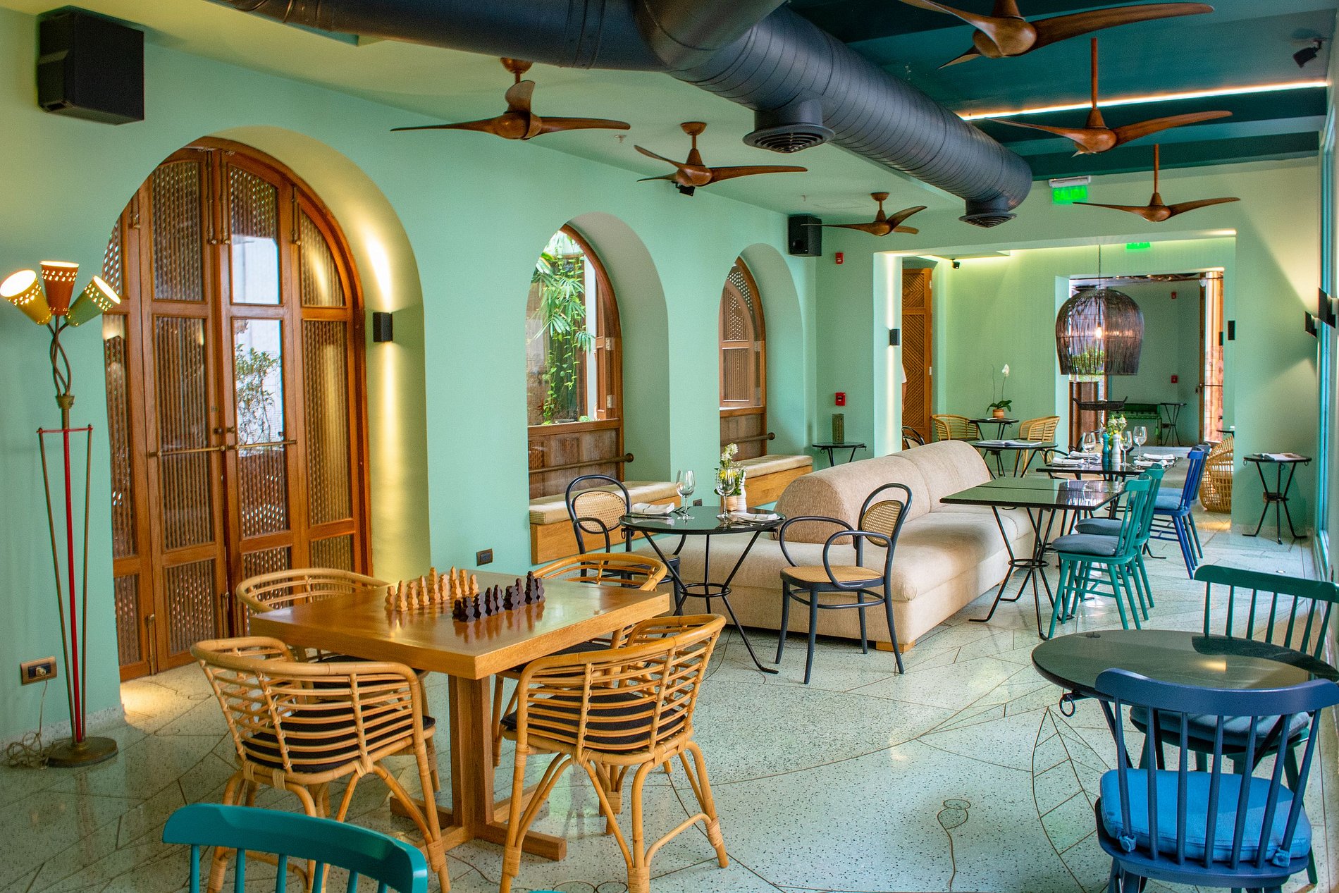 La zone de restauration est assez spacieuse et sa décoration est inégalée. Dans ses plafonds, il a une structure en métal cuivré, reliée par des pièces en forme de puzzles et un conduit rond qui favorise la ventilation du lieu. Le bar propose la plus grande variété de cocktails typiques de la région et du pays.