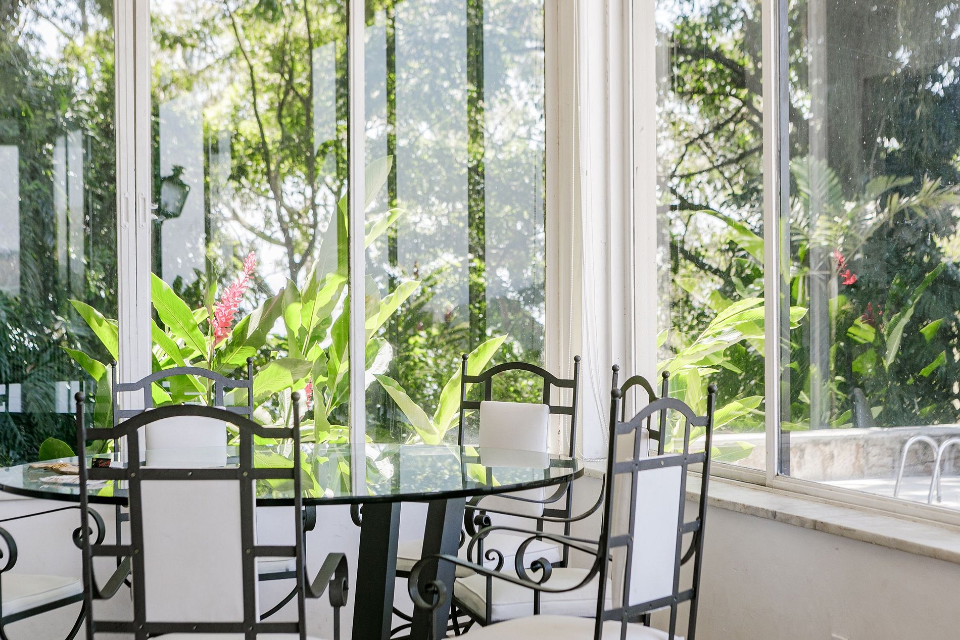 Le jardin d'hiver surplombe le petit pont et la piscine, à son tour bordée par de grands palmiers et des arbres fruitiers exotiques, pleins de couleurs tropicales.