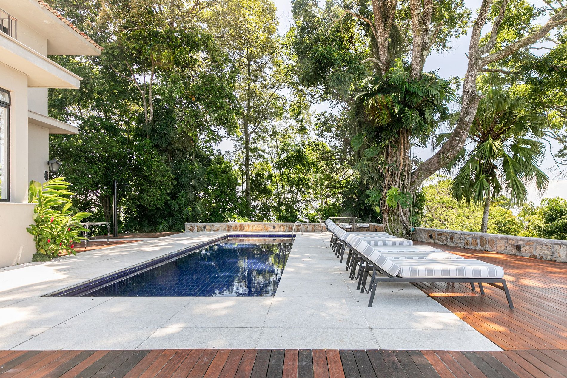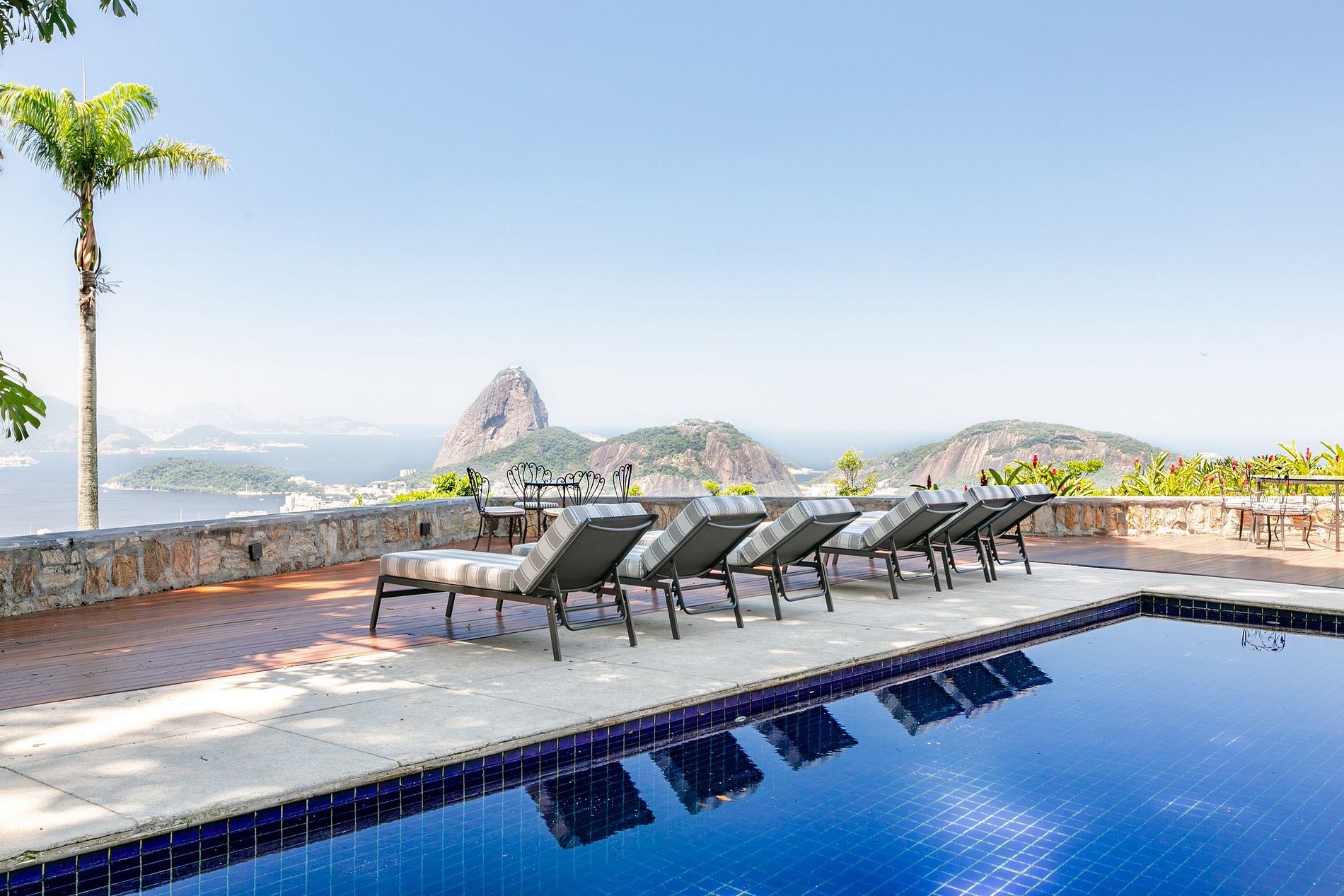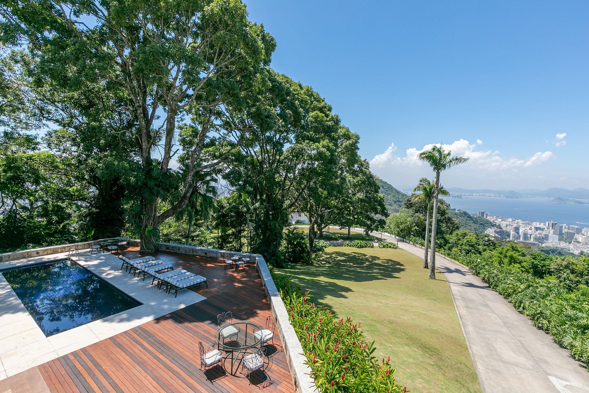 Cette fabuleuse villa à l’allure majestueuse se cache dans les hauteurs de Santa Teresa. Située dans une copropriété privée, la sécurité y est assurée 24h sur 24h.
