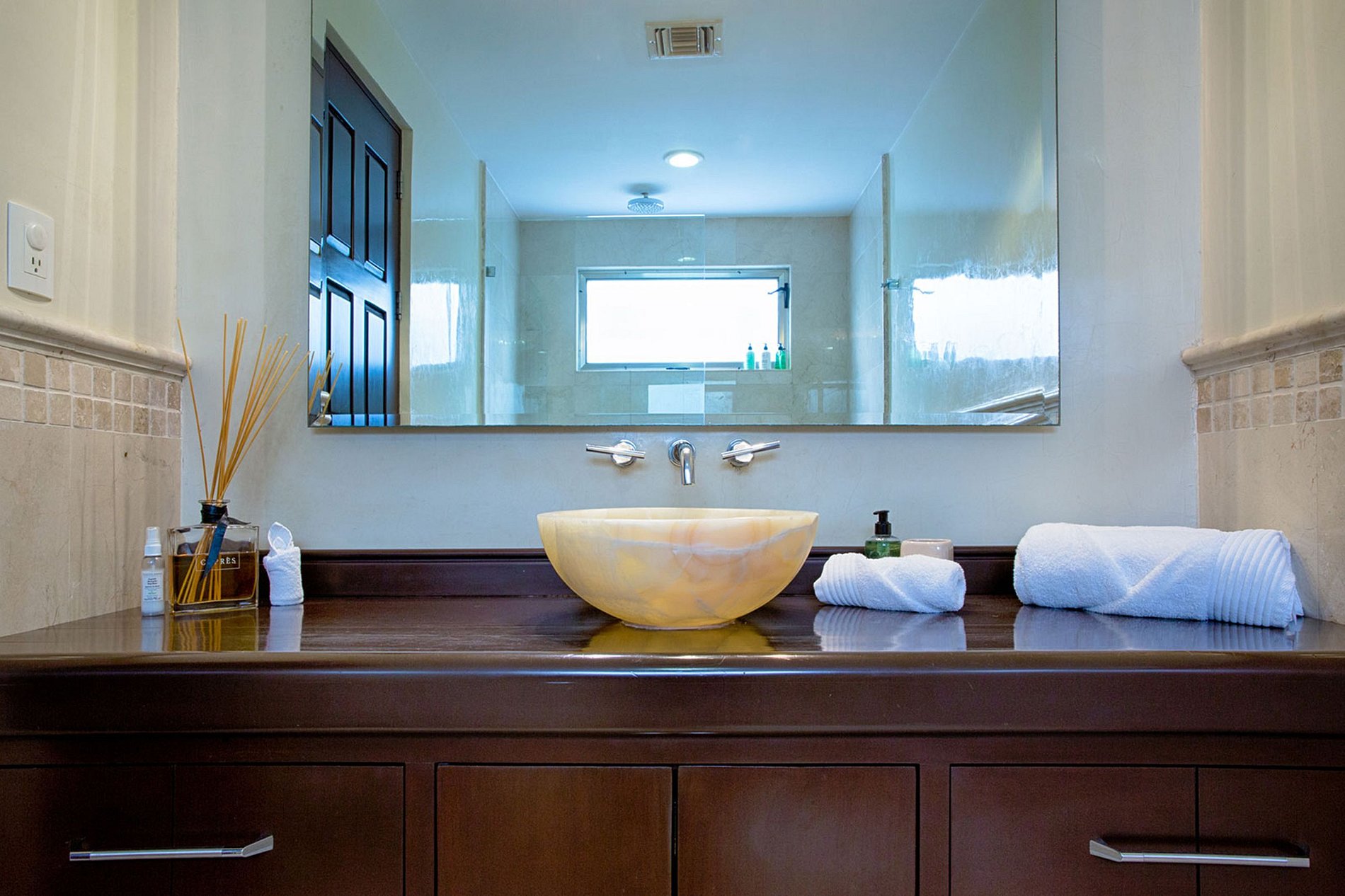 En montant à l'étage supérieur, vous serez captivé par la magnifique chambre des maîtres, dotée d'une ravissante salle de bains pour lui, d'un spacieux dressing en acajou, d'un coin salon, d'une baignoire jacuzzi relaxante, de la climatisation, d'une ventilateur de plafond, une télévision à écran plat, une antenne parabolique et une terrasse couverte par une grande palapa qui surplombe une piscine à débordement. La Villa Turquesa est meublée avec la plus grande attention aux détails, y compris des draps de haute qualité, de la porcelaine élégante, des œuvres d'art captivantes et tout ce dont vous pourriez avoir besoin pour vos vacances ou votre séjour de longue durée. La villa comprend des portes surdimensionnées, des luminaires personnalisés, des couvre-fenêtres professionnels et un système de cinéma maison Bose avec haut-parleurs.