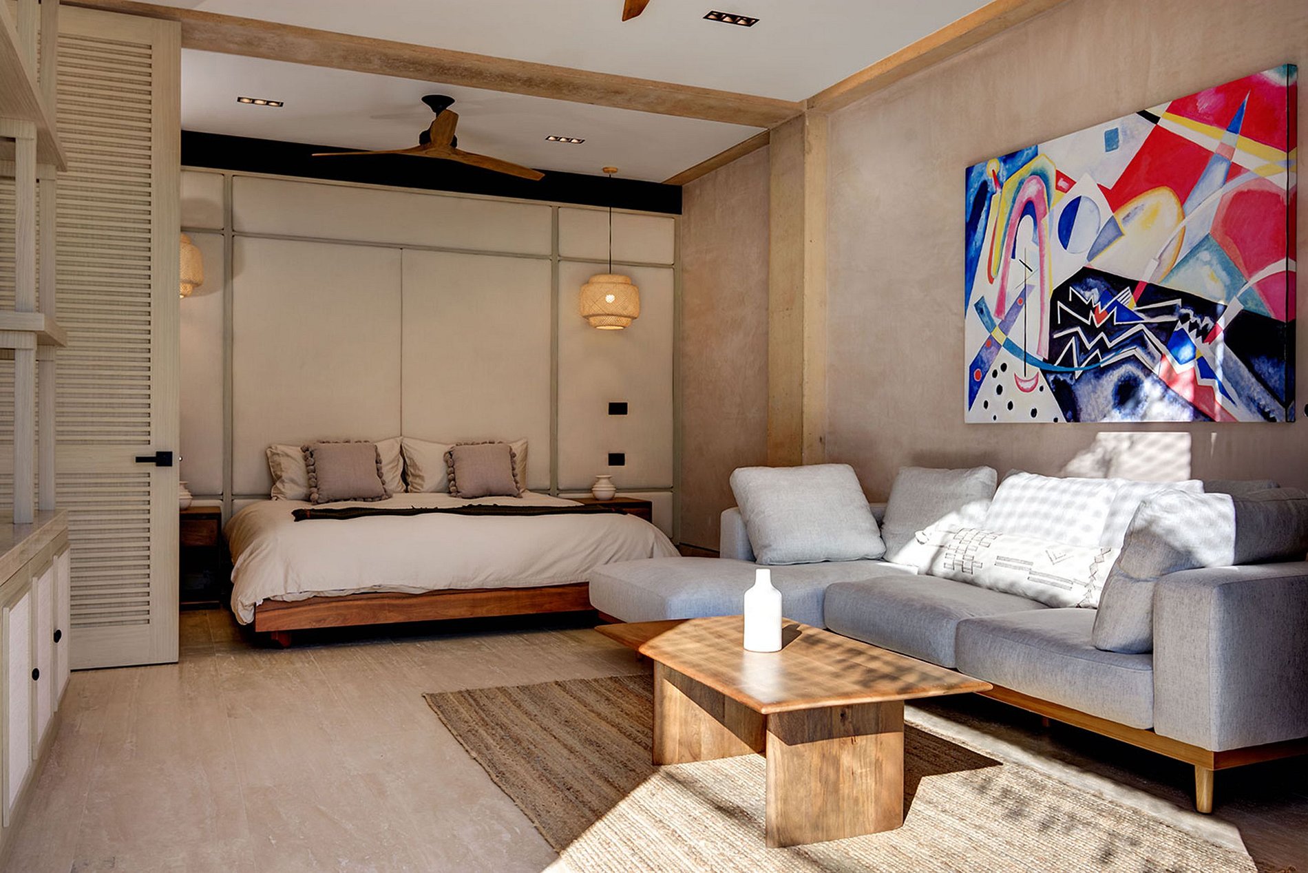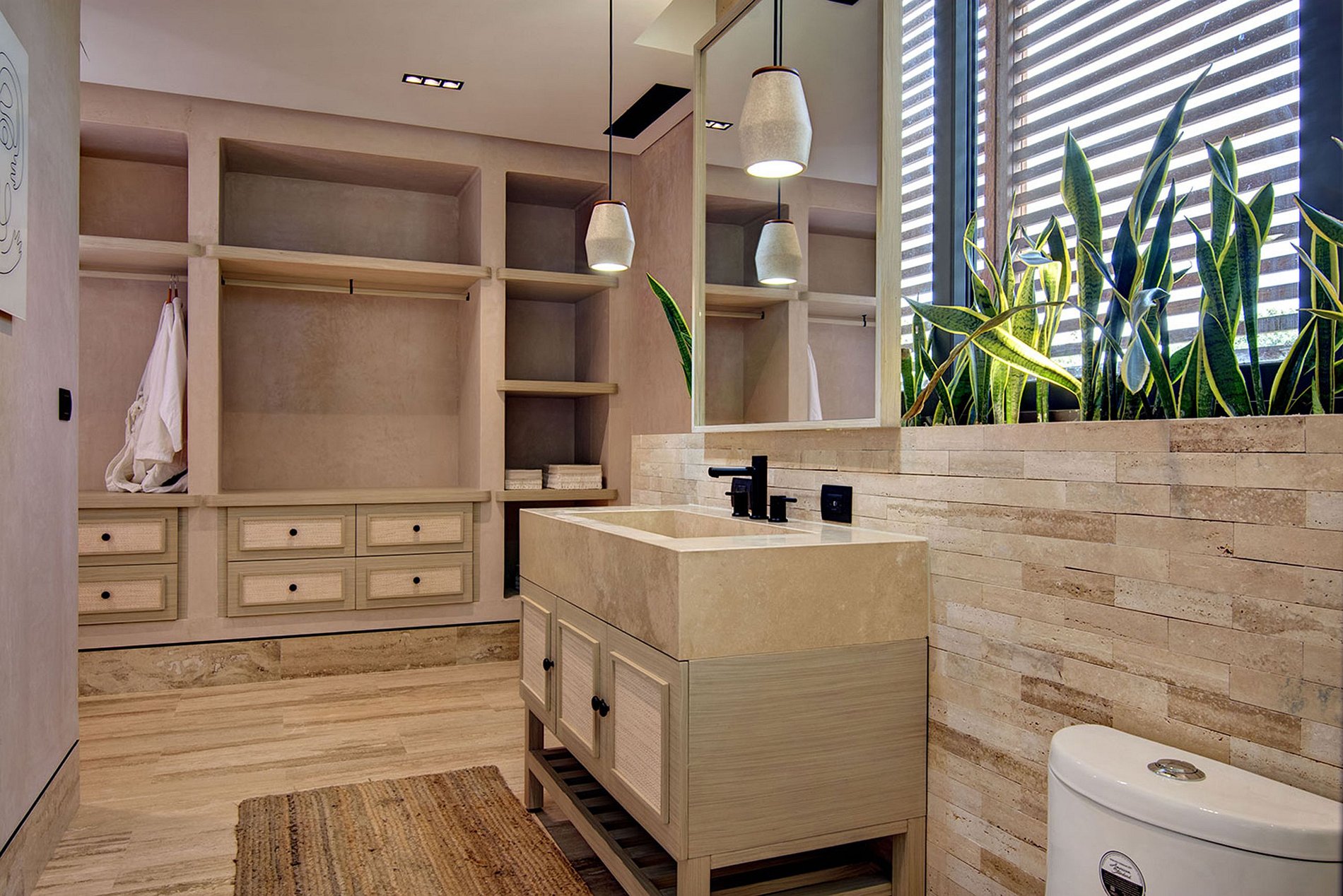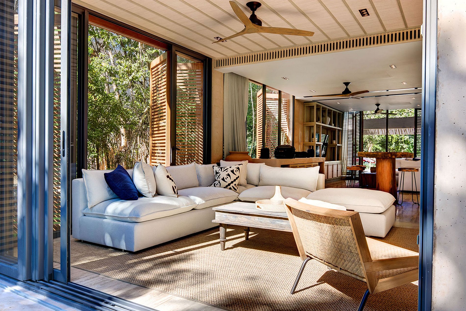 Entourée de verdure indigène, cette résidence présente un impressionnant espace de vie extérieur de 900 pieds carrés, comprenant un salon-terrasse, un élégant bassin profond et de vastes balcons. La disposition de la villa au rez-de-chaussée fusionne harmonieusement les intérieurs modernes avec l'environnement dynamique, incorporant des éléments organiques partout. Malgré son lien étroit avec la nature, la maison conserve une atmosphère tranquille et privée, nichée au milieu de la végétation indigène.
