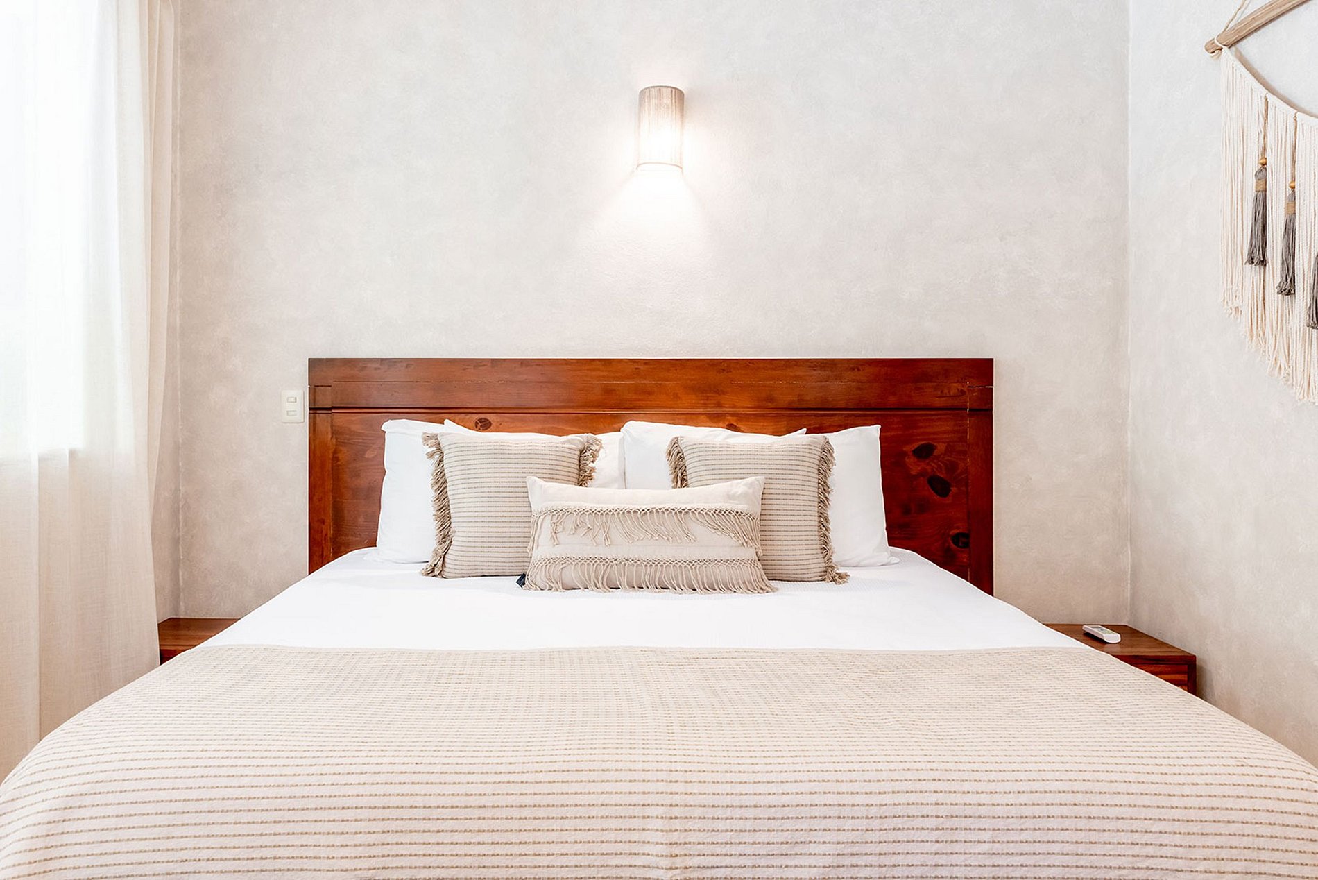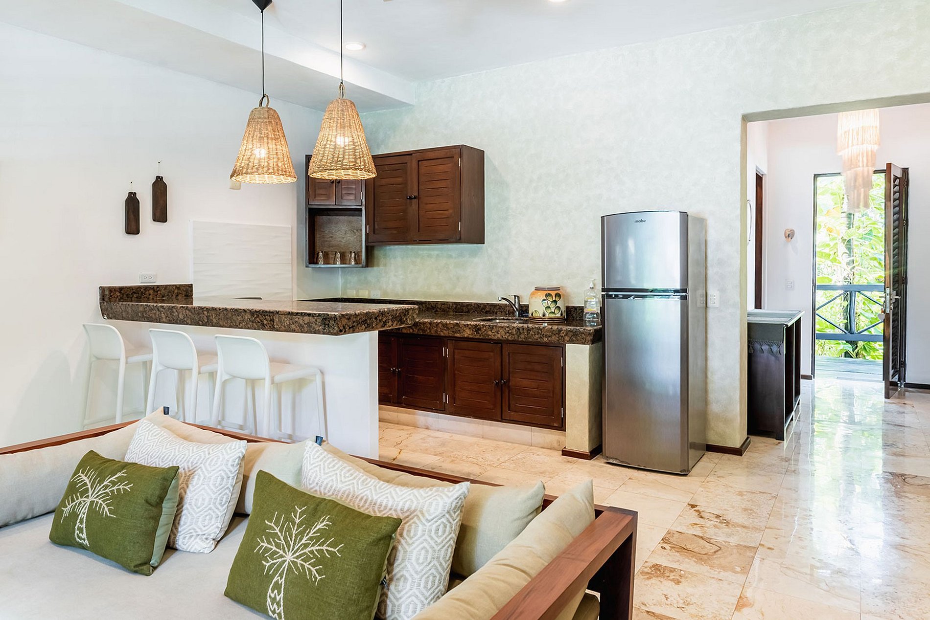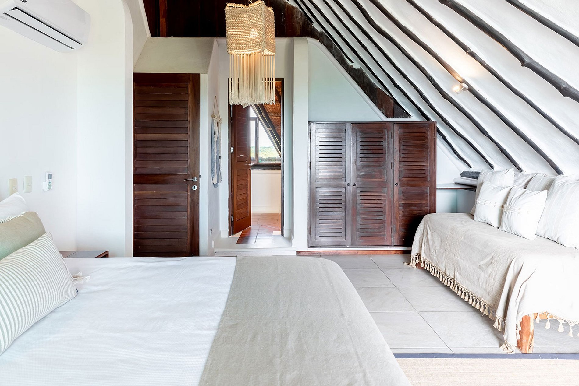 MISTRAL : Préparez-vous à être captivé par la beauté panoramique au deuxième étage. MISTRAL comprend des espaces communs généreux, un salon extérieur avec des terrasses couvertes et sert de point de rassemblement pour l'ensemble du groupe. Il comprend deux grandes chambres climatisées avec salles de bain privatives. La chambre face à la mer dispose d'un lit king-size, tandis que l'autre chambre dispose d'un lit queen-size et d'une terrasse privée donnant sur le jardin tropical. Ces hébergements peuvent accueillir de 2 à 5 personnes, vous permettant de vous détendre sur de confortables transats en plein air et de profiter de la douce brise marine.